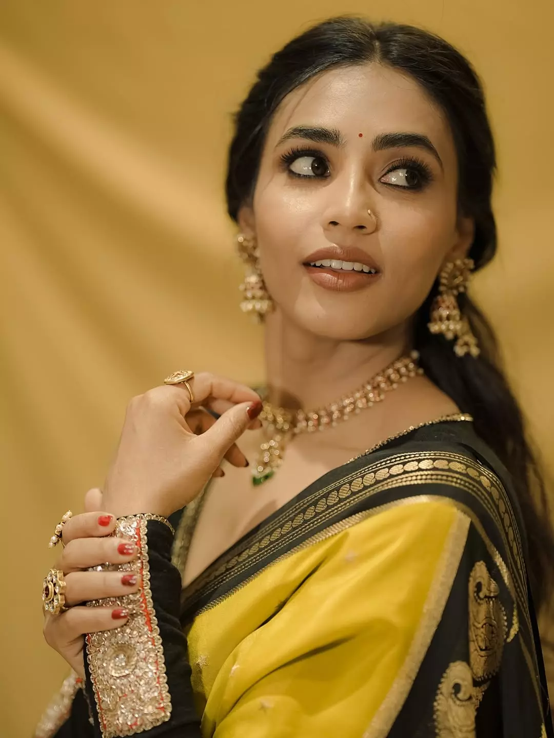 Sapthami first became well-known after her role in the Kannada movie Kantara. Her performance in that film brought her a lot of appreciation from both audiences and critics. After that, she started getting more opportunities in different languages, including Telugu and Hindi films.