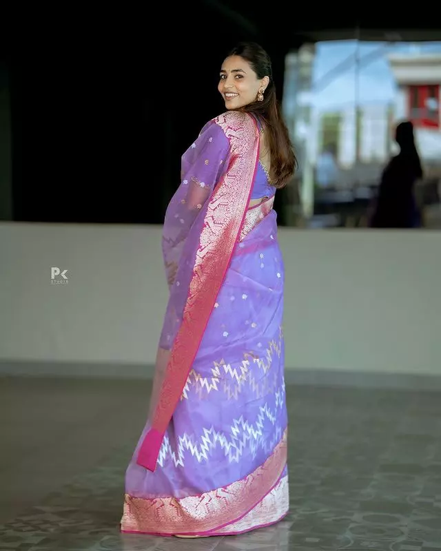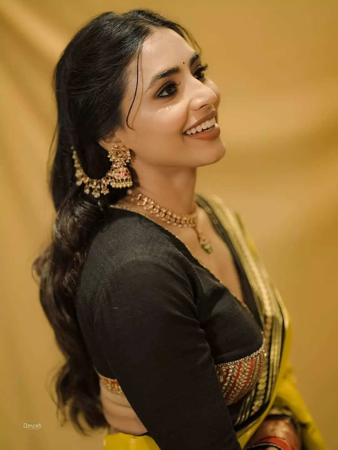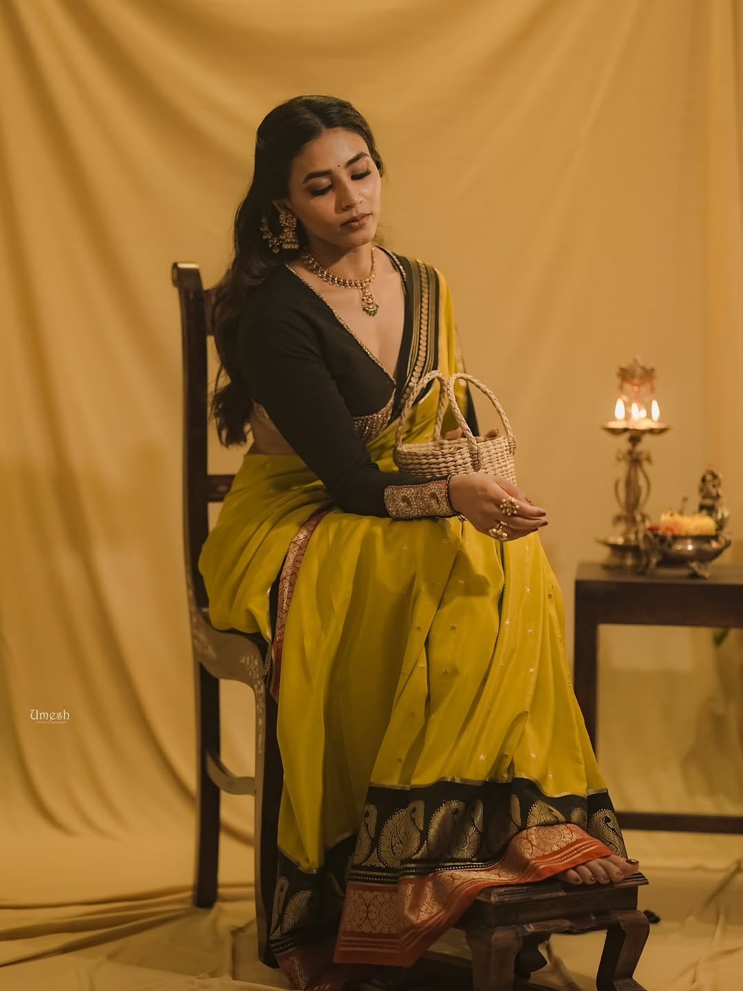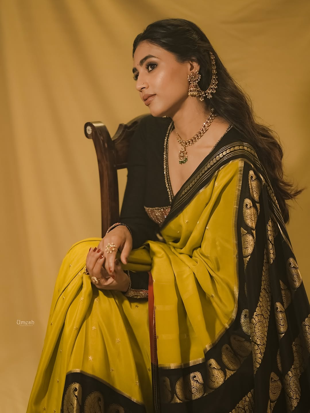 By: Priya Chowdhary Nuthalapti | 12 Oct 2025 3:00 PM ISTSapthami Gowda slays in her latest saree stills. She wrote, “KSIC is LOVE ❤️.” Her post quickly received thousands of likes and comments. In the picture, Sapthami is seen wearing a yellow KSIC silk saree and paired it with a black blouse from Sithara Kudige. Her jewellery was from Gajraj Jewellers. The styling was done by Rachna Satish. Her hair and makeup were handled by Romithokchom. The photo was taken by Umesh Photography.