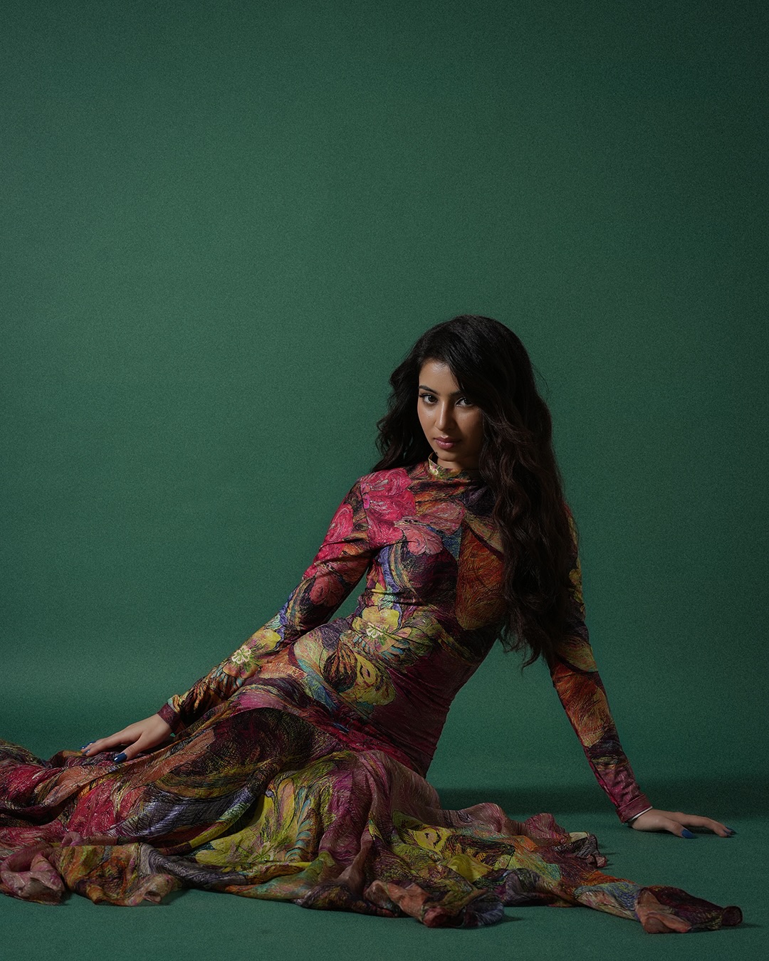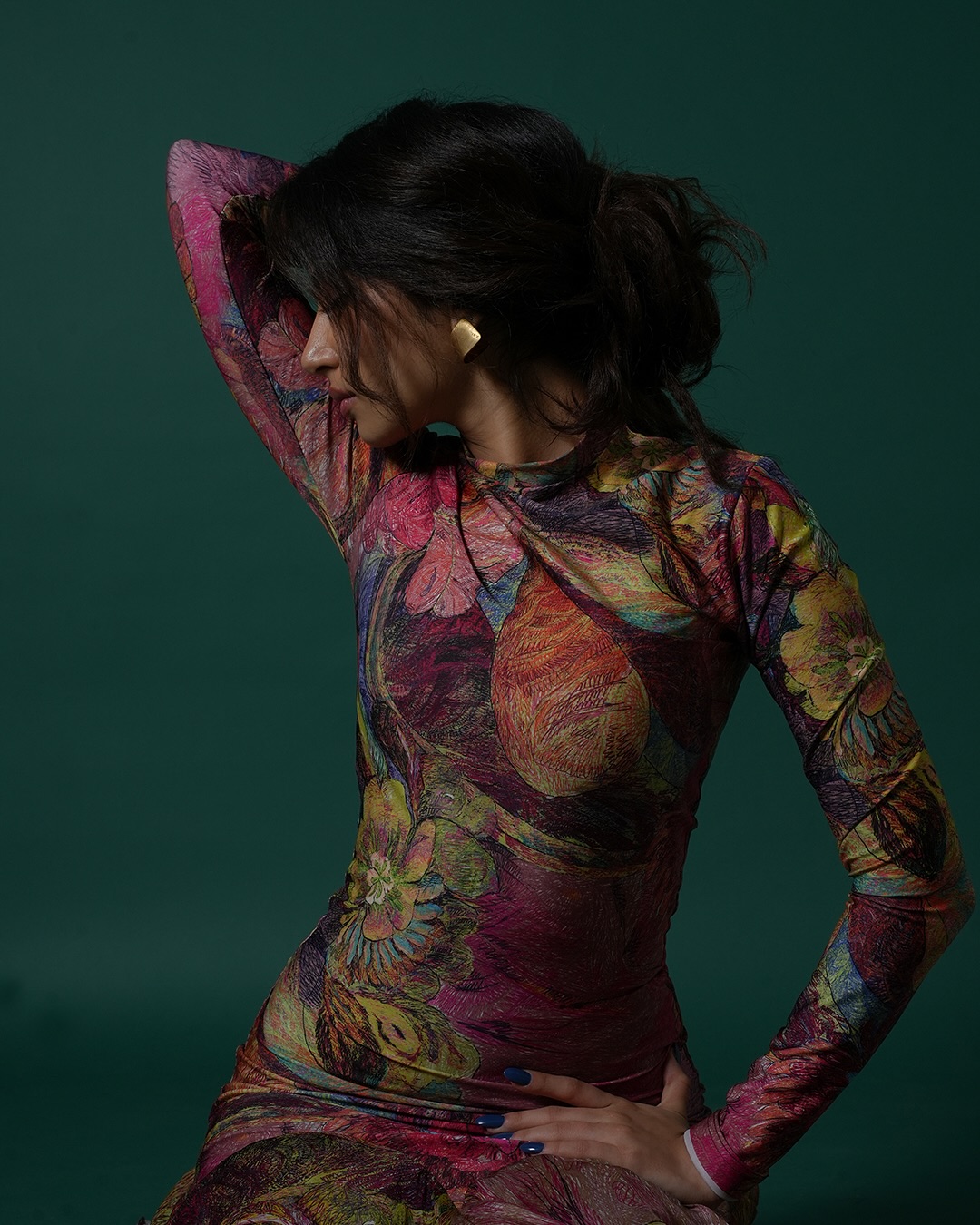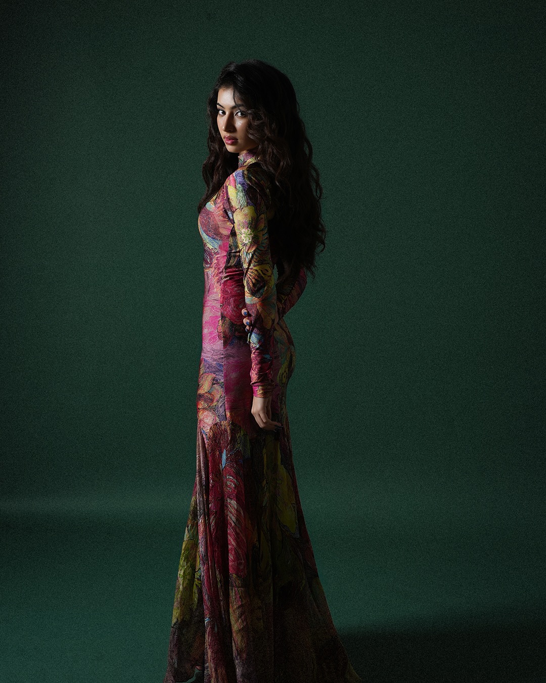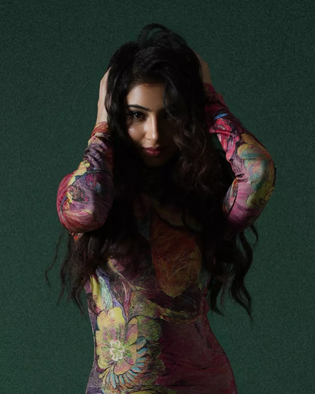 In this captivating photo, Sara radiates effortless charm and confidence, with long wavy hair cascading over a vibrant green tiger-print halter dress, her subtle smile and mole adding to her alluring, grown-up appeal against a soft lime backdrop.