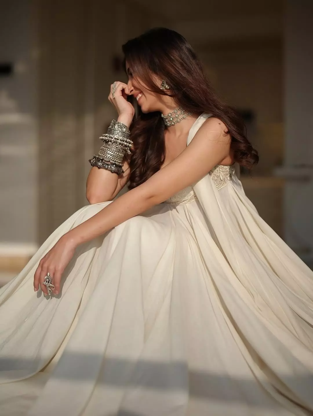 Sara Arjun once again caught everyone’s attention. The photo shows Sara in a soft, elegant look. She is dressed in a light-colored traditional dress with delicate embroidery. Her jewellery is simple but eye-catching and her open hair adds to the gentle mood of the picture. The caption, set to a soulful song by Shashwat Sachdev, Arijit Singh and Irshad Kamil.