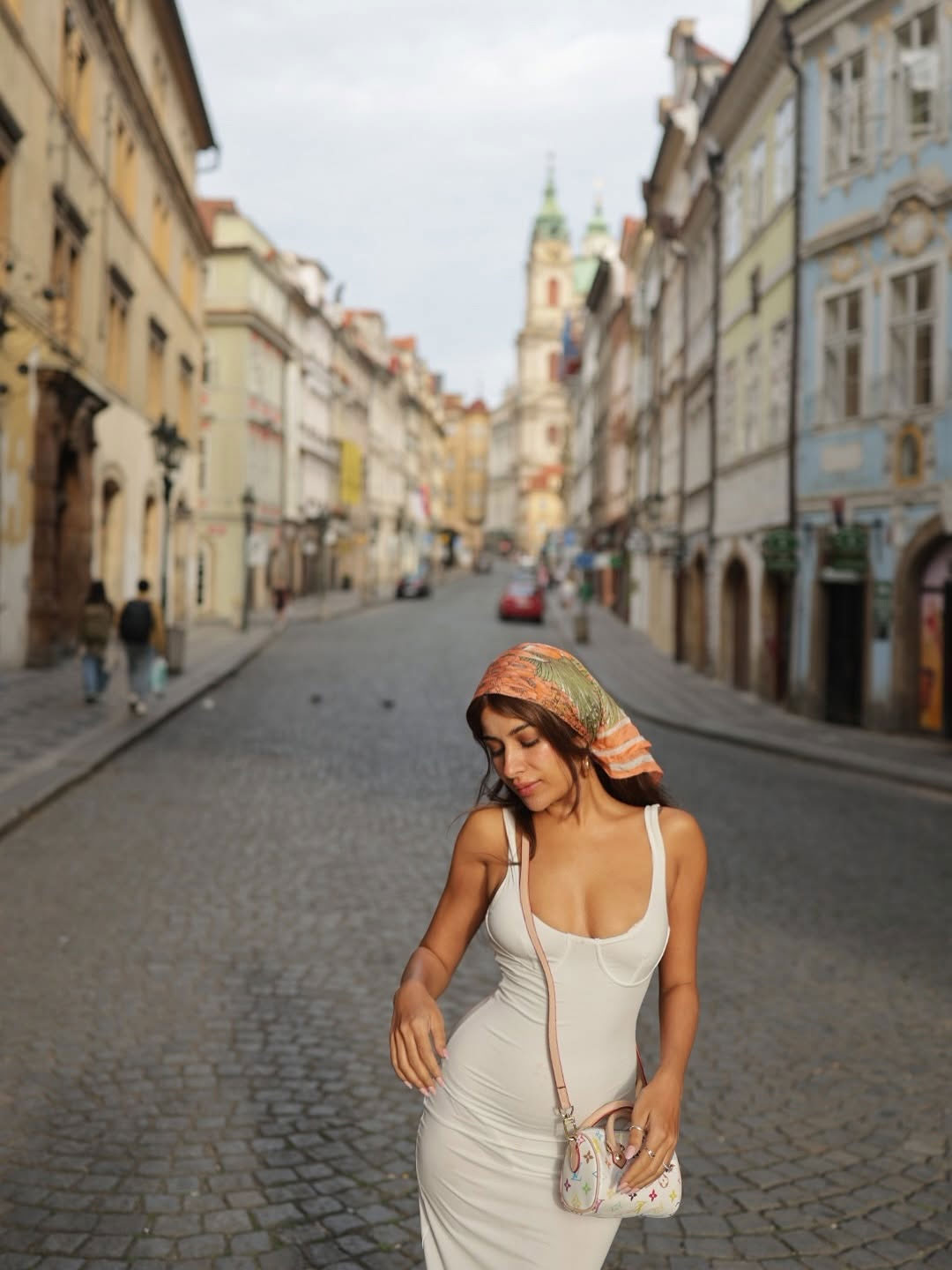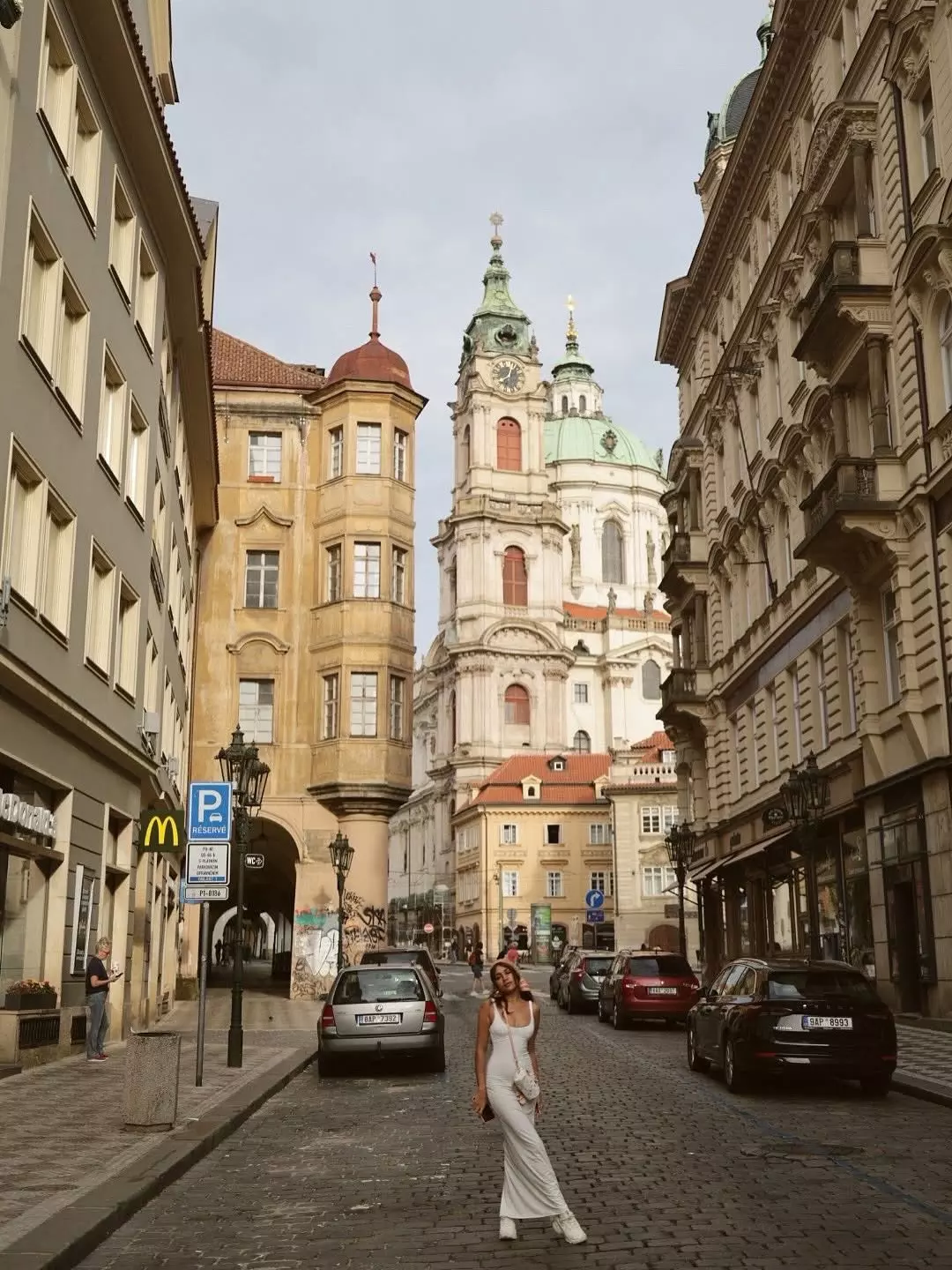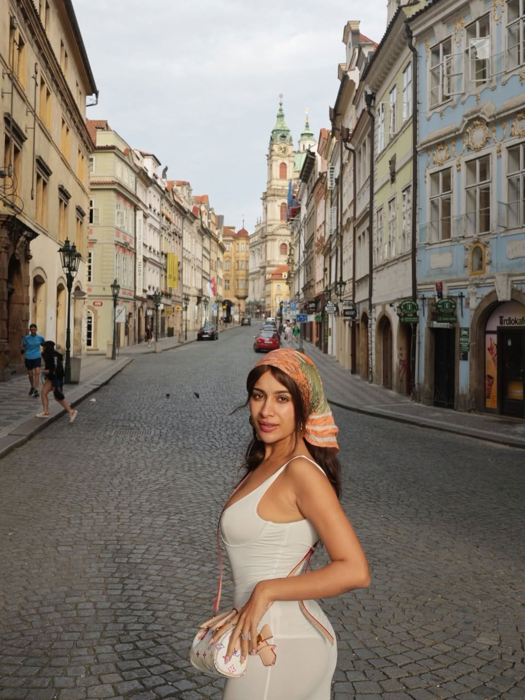 Sara Gurpal shared a charming photo from her travels on Instagram. She is seen walking along a cobbled street lined with historic European buildings. The view in the background shows a stunning church with tall spires and a green dome. The scene looks peaceful and picturesque. Sara is wearing a long white dress with casual shoes. She carries a small white handbag. She poses naturally while enjoying the beauty around her.
