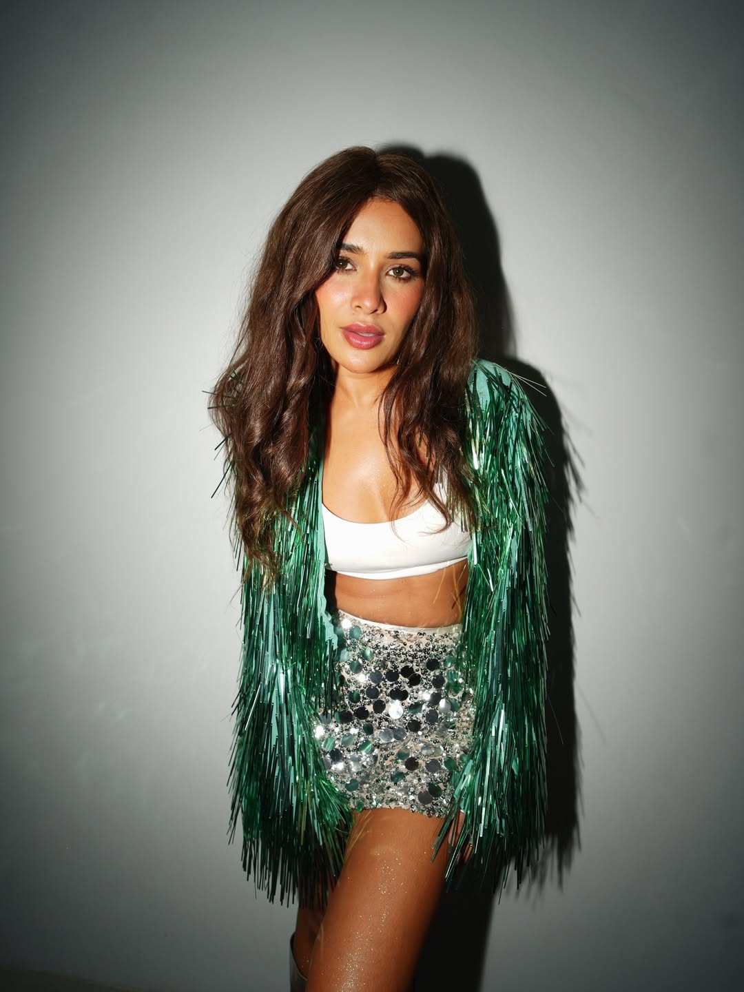 By: Priya Chowdhary Nuthalapti | 1 Sept 2025 1:30 PM ISTSara Gurpal shared a new set of pictures on Instagram. In the first photo, she is posing with style and energy. She is wearing a white crop top with a shiny silver skirt. A green sparkling jacket adds more charm to her look. Her silver high boots make the style even more eye-catching. She is spreading a fun mood with her lively expressions. Sara is blowing a kiss toward the camera in this frame.