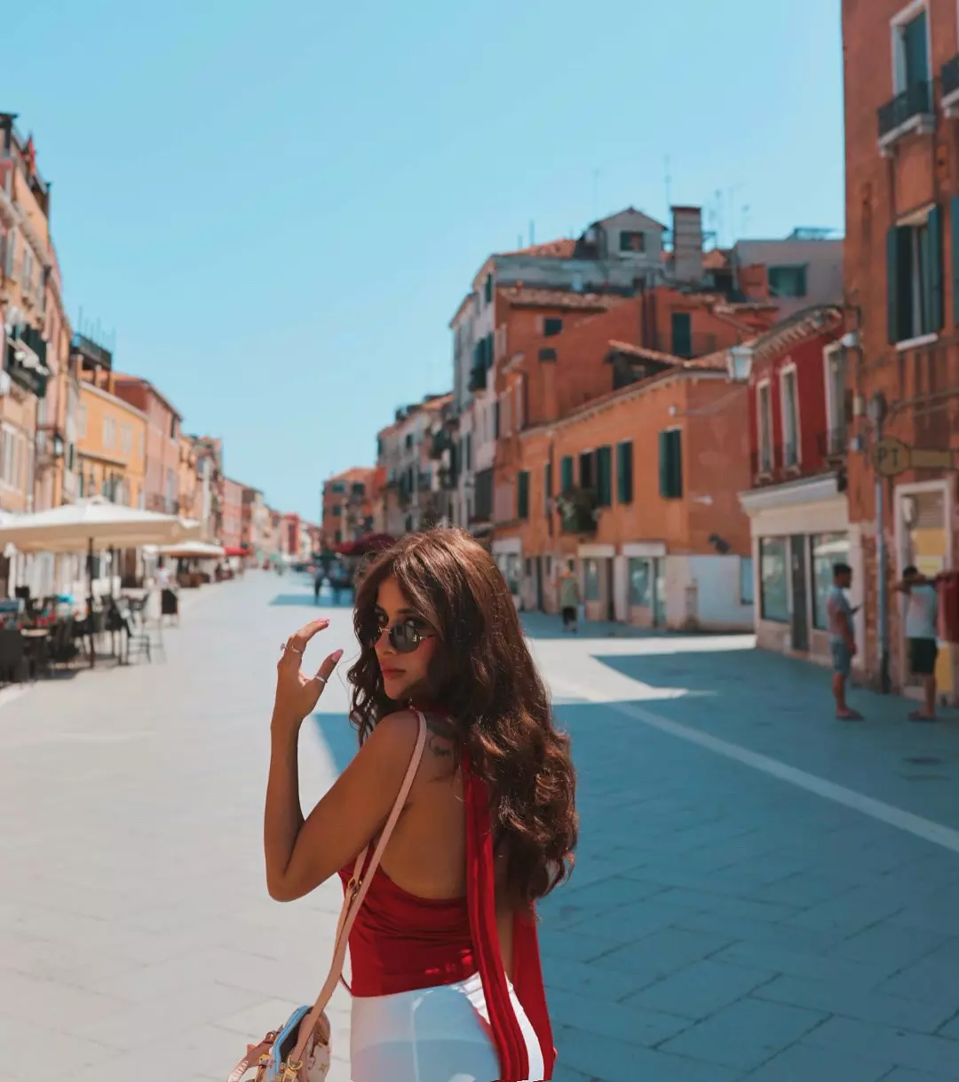 Sara Gurpal radiates elegance and confidence as she strolls through the rustic street lanes, blending modern fashion with a classic backdrop. The deep red top paired with a sleek white skirt highlights her bold yet graceful persona, while her minimal accessories complete the look with perfection. #Sarakehndi deleting in few hours 🙂‍↔️ makes this capture all the more exclusive and special.
