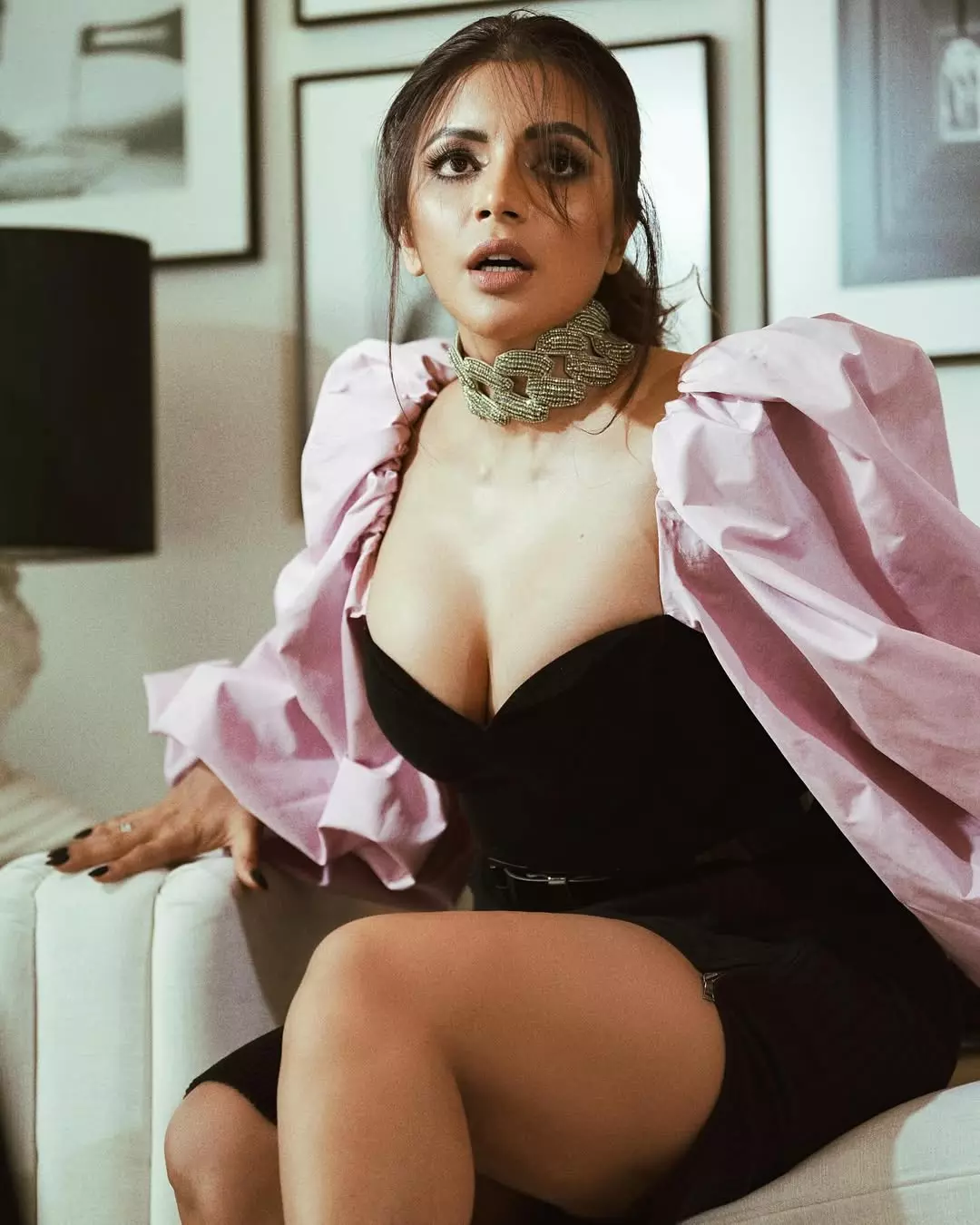 This striking photo captures Shama lounging elegantly on a white sofa in a luxurious indoor setting. Dressed in a plunging black mini dress with dramatic pink puffed sleeves and a statement choker necklace, her tousled hair and intense gaze radiate seductive confidence and high-fashion drama.