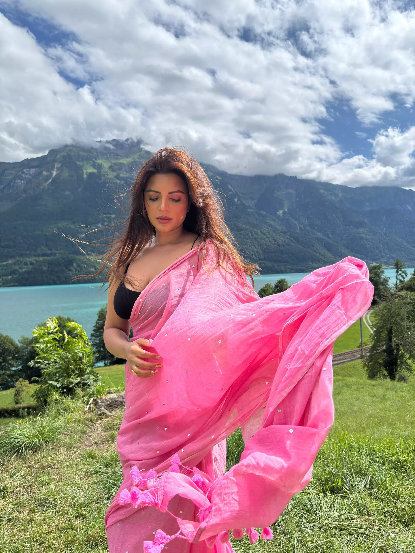 Actress Shama Sikander captivates hearts in her latest appearance, donning a stunning pink saree that perfectly complements her radiant charm. The soft hue enhances her elegance, while the delicate drape reflects her timeless beauty and confident aura. Known for her impeccable style, Shama continues to redefine sophistication with every look she carries.