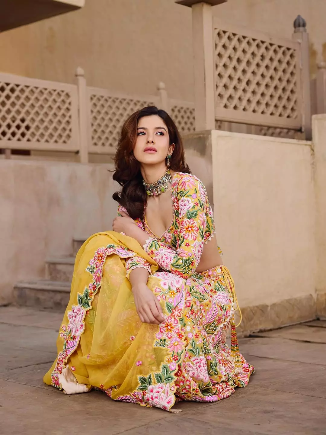 Shanaya Kapoor blooms like a Rajasthani spring in a sunshine-yellow lehenga bursting with hand-embroidered pastel florals, the scalloped choli and dupatta edged in delicate pink threadwork that dances with every step. A statement emerald choker from @indinoorjewellery gleams against her décolletage, while soft waves cascade over one shoulder—pure royalty in heritage couture by @abusandeepindia @taruntahiliani, styled by @tanghavri, makeup @priyalahon, hair @inaflare. The soon-to-debut star turns marble arches into her personal palace runway.