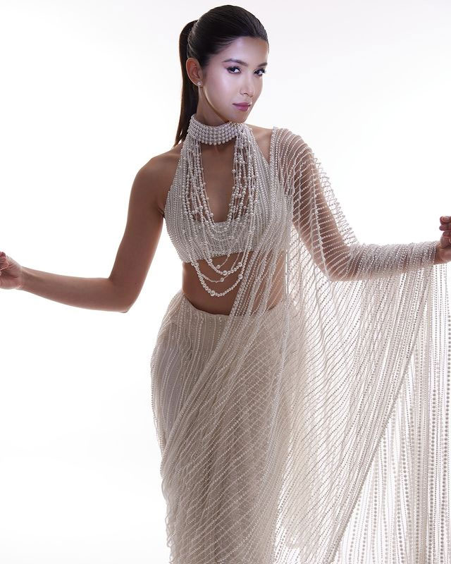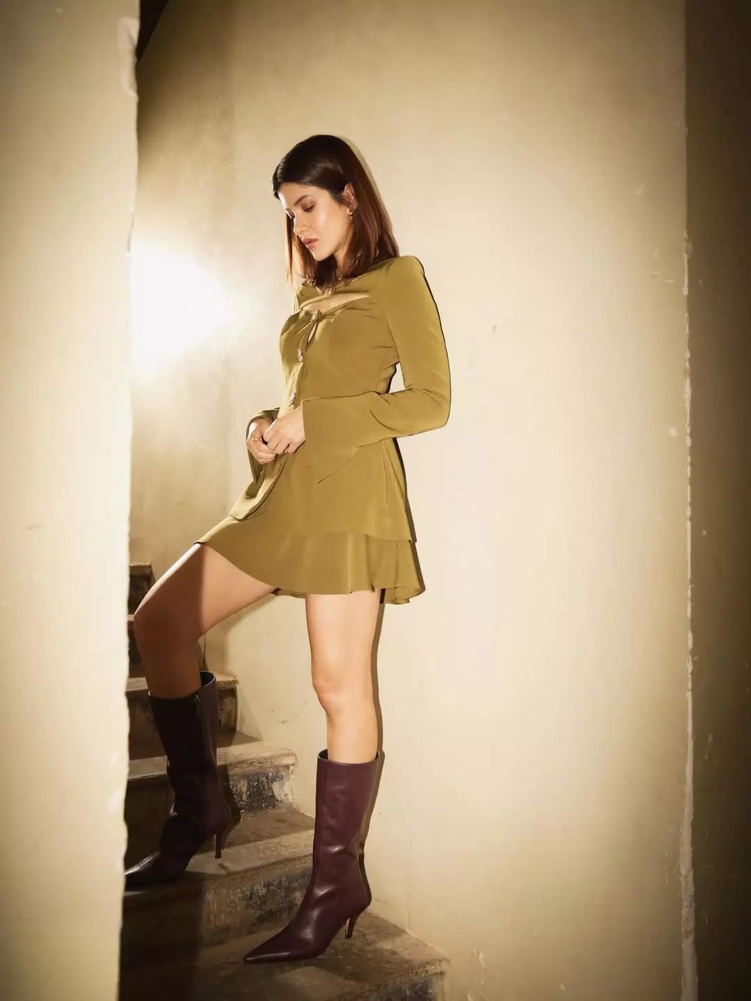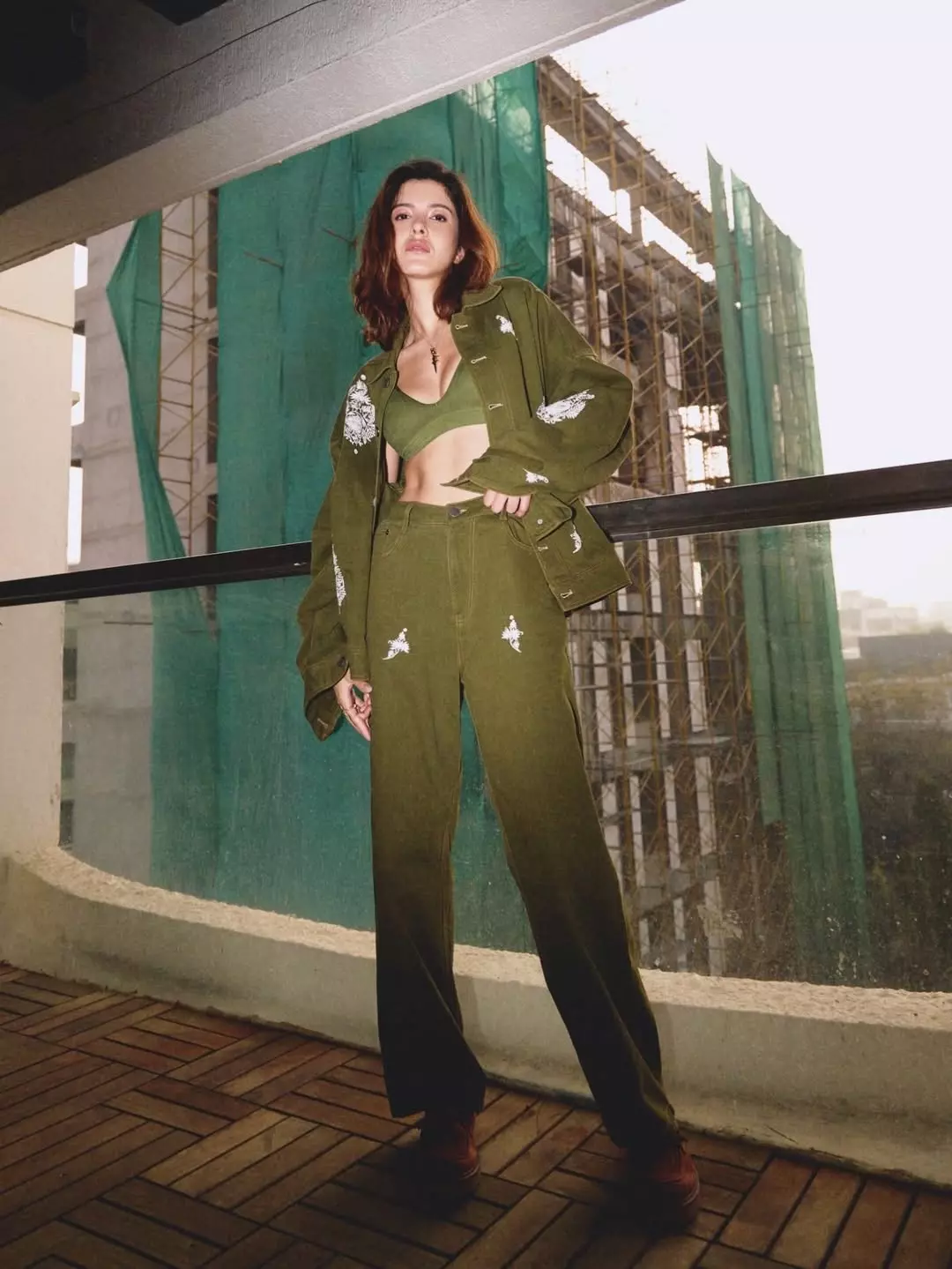 The outfit featured an olive-green jacket adorned with delicate white embroidery, layered over a matching bralette or crop top. Wide-leg trousers in a denim-like fabric completed the look, offering comfort, movement, and a relaxed yet polished vibe. The interplay of structured embroidery and loose silhouettes made the ensemble versatile—perfect for street-style moments or casual photoshoots.