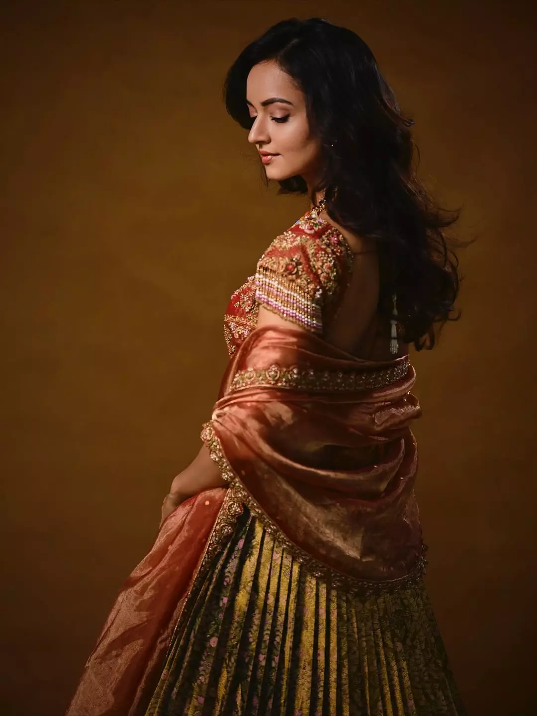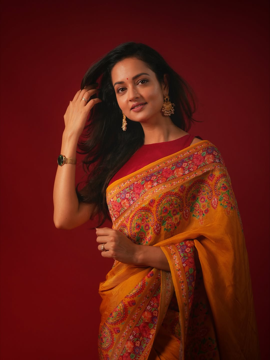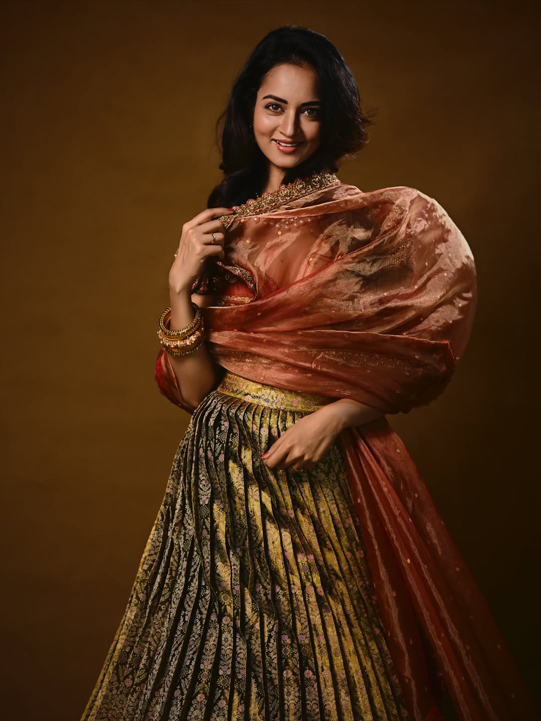 Her look effortlessly blends classic elegance with delicate festive touches, making her a true vision of beauty and tradition.