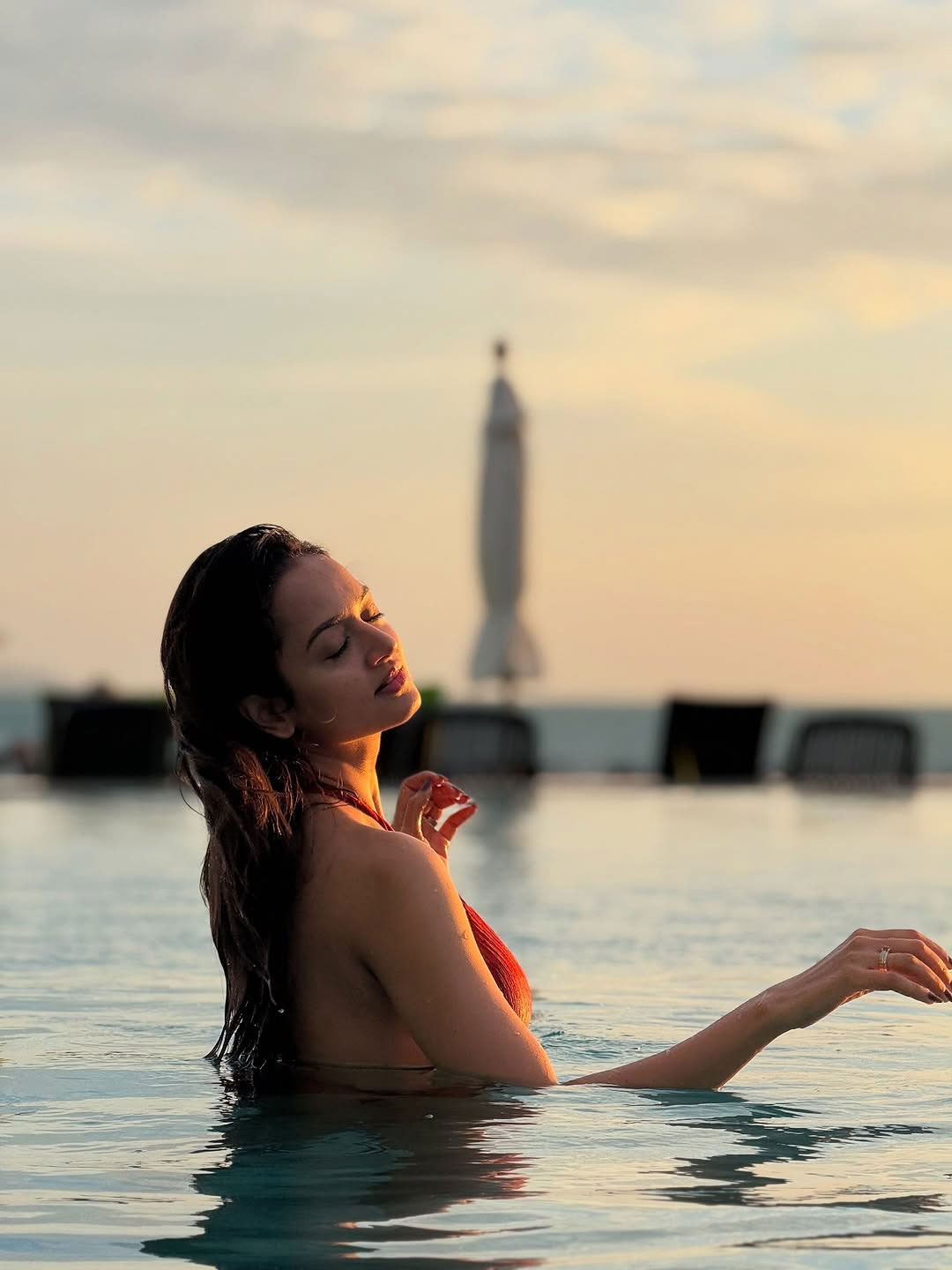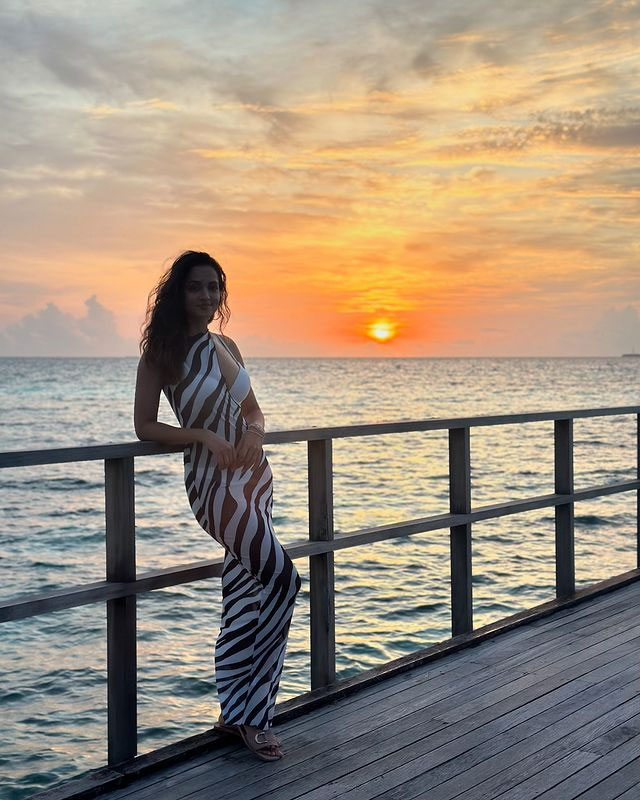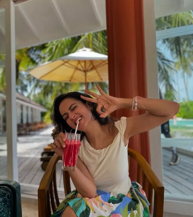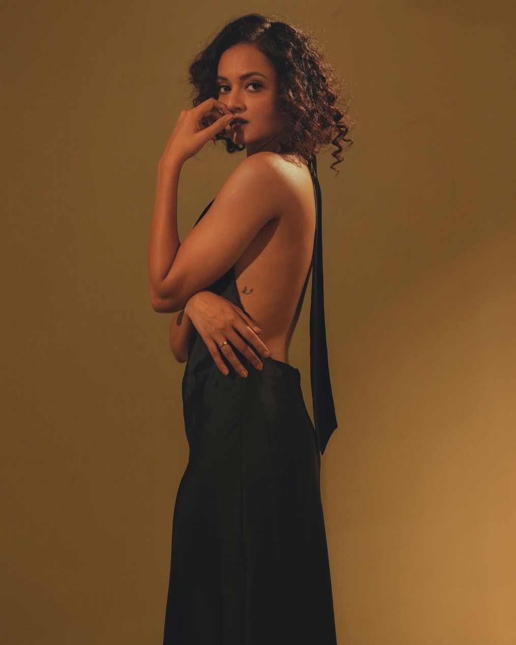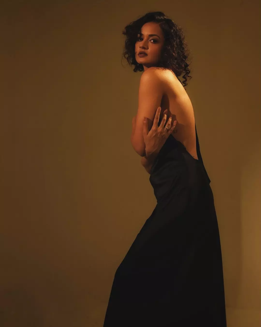 Shanvi Srivastava embodies effortless grace in a backless maxi dress featuring a sophisticated halter-neck design. The flowing silhouette speaks through its simplicity, allowing elegance to take center stage without relying on excess detail. The halter neckline beautifully frames her shoulders, while the open back introduces a modern edge that feels subtle and tastefully balanced.