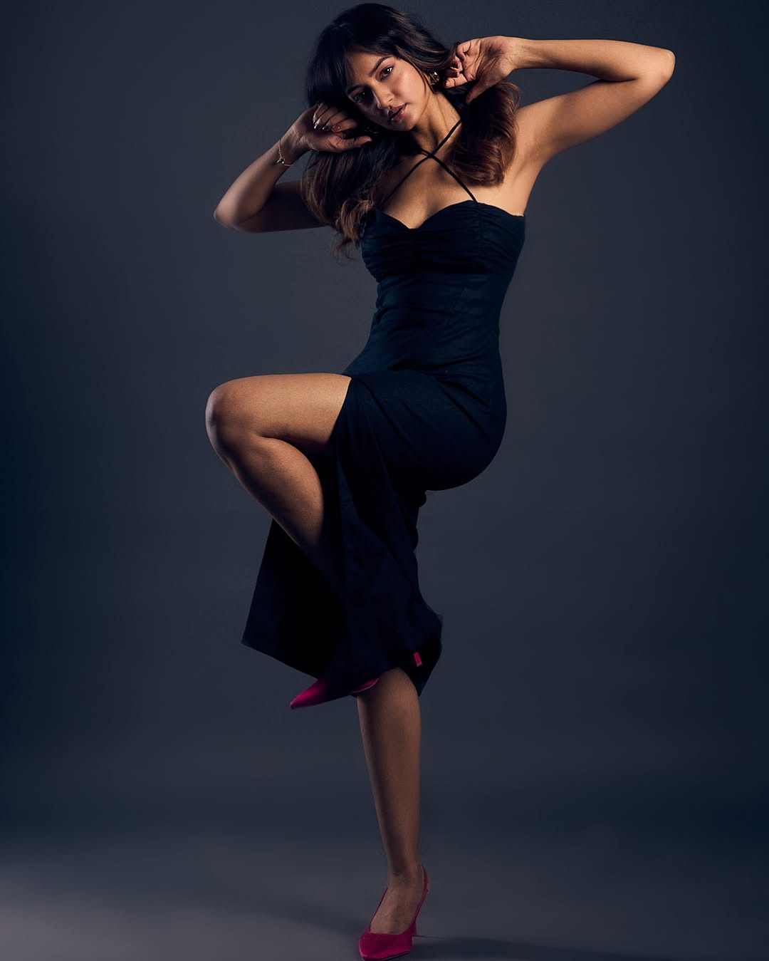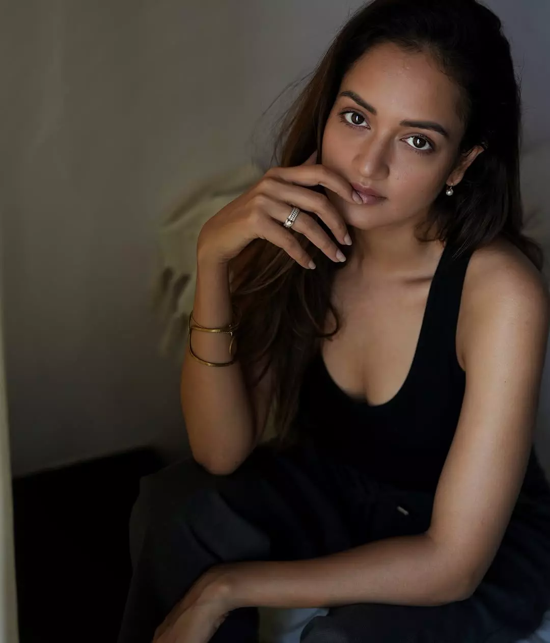 Actress Shanvi Srivastava shared a striking photo on her Instagram captioning it: "Owwa Owwa!!" She wore a golden thread work dress with v neck. Her hair style and makeup are just wow.