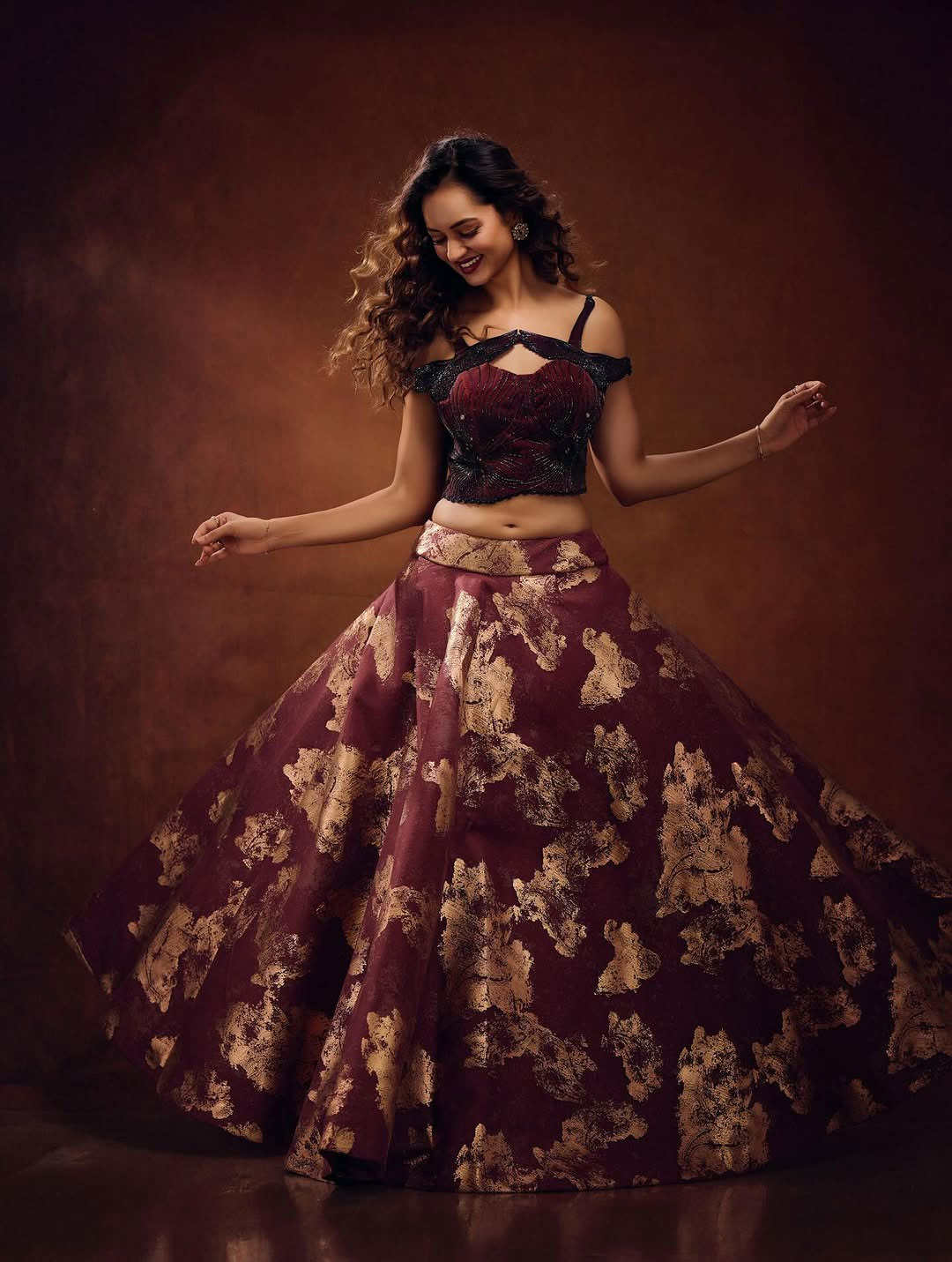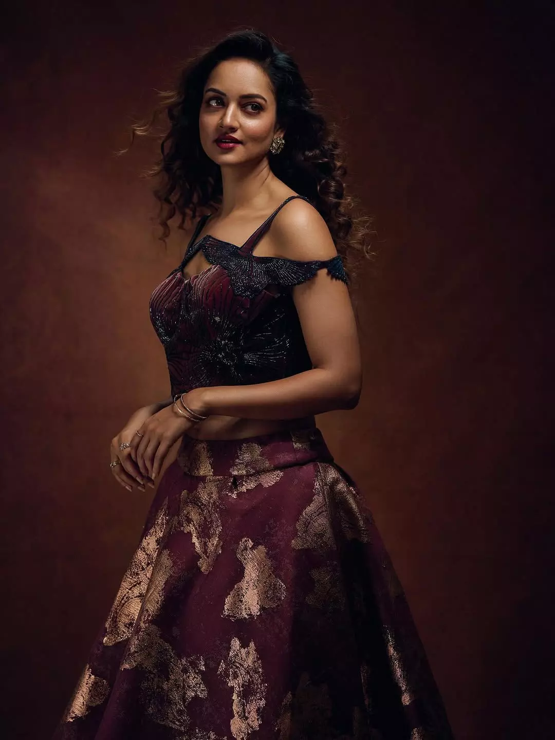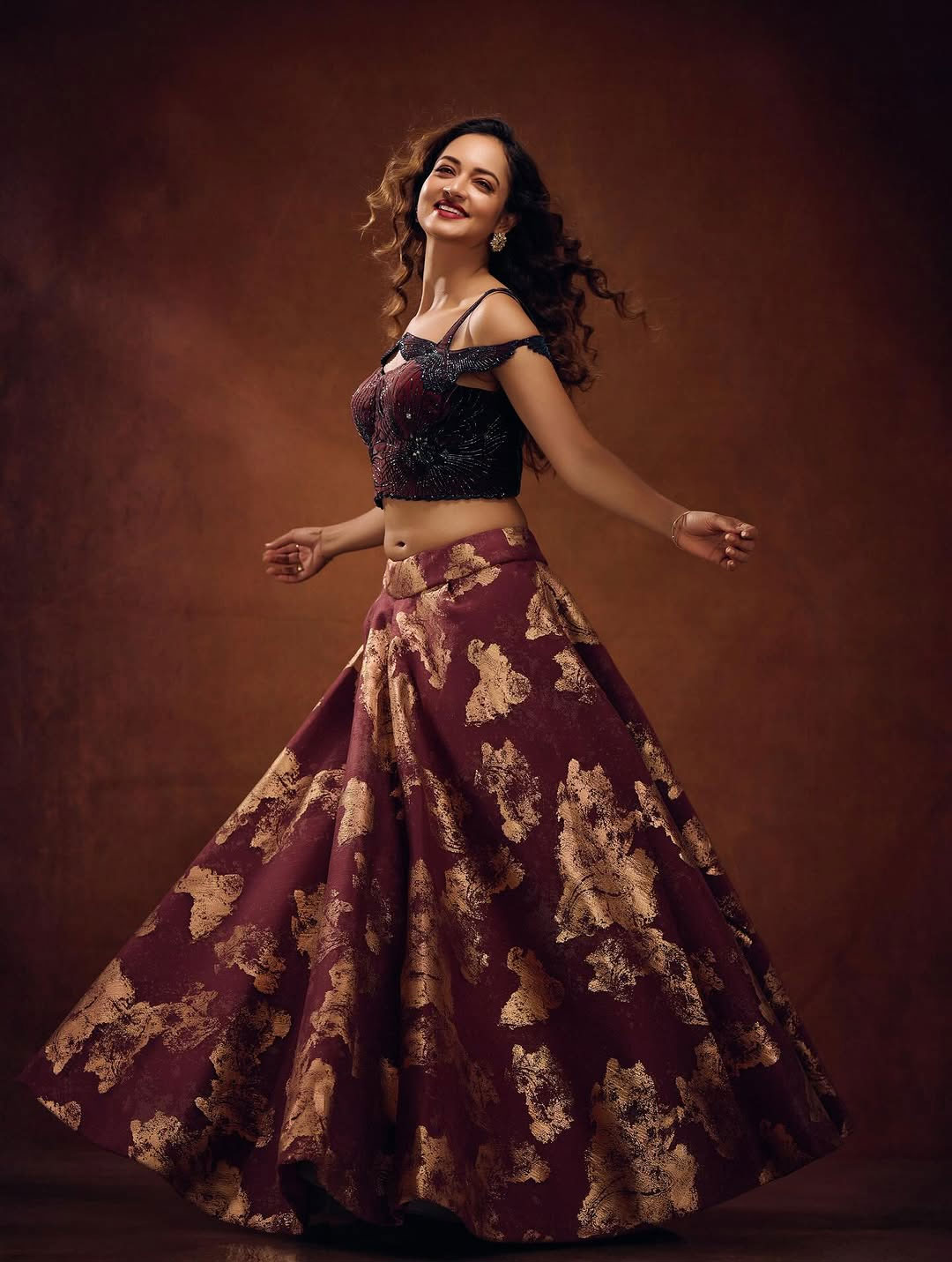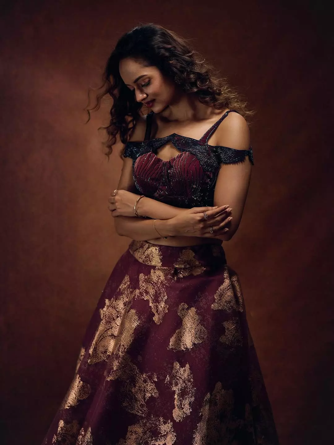 Actress Shanvi Srivastava recently shared a captivating photo from a traditional-themed editorial shoot. She wore a maroon lehenga with golden floral patterns perfectly styled to bring out a classic festive charm. The shoot was done for Label Ankitha Raj and Shanvi credited the creative team behind the image in her post.