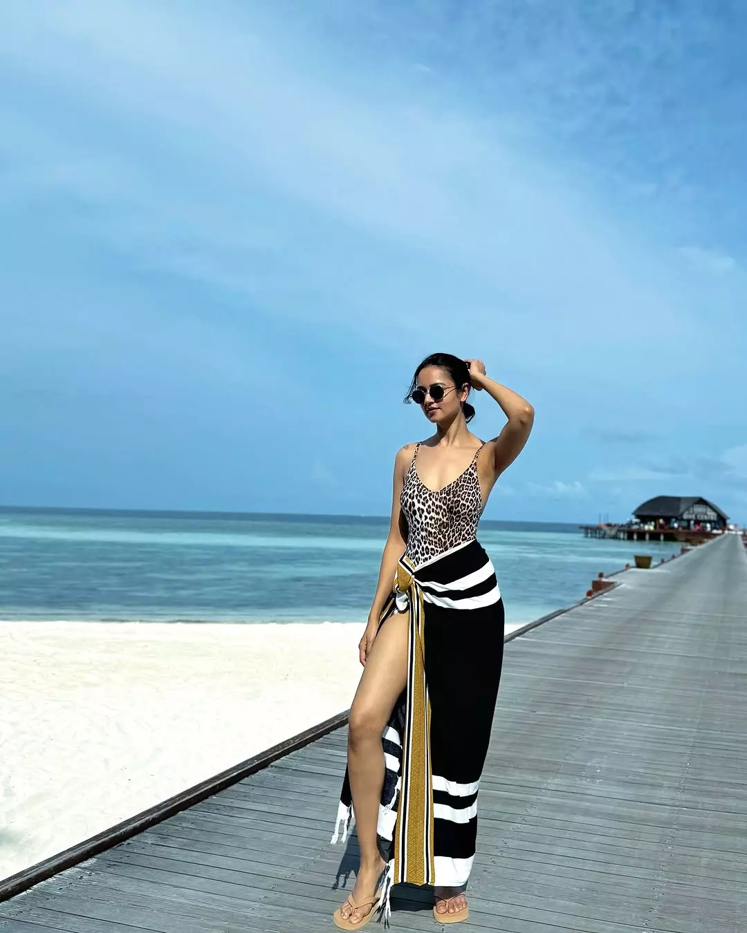 Shanvi Srivastava is serving major vacation vibes in her latest stunning photo, posing confidently in a white bikini against a breathtaking ocean backdrop.
