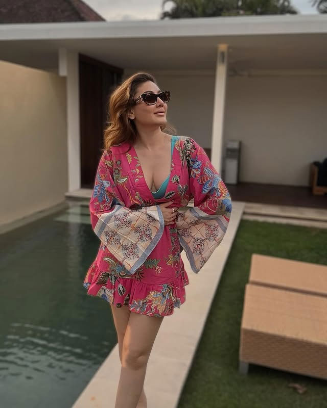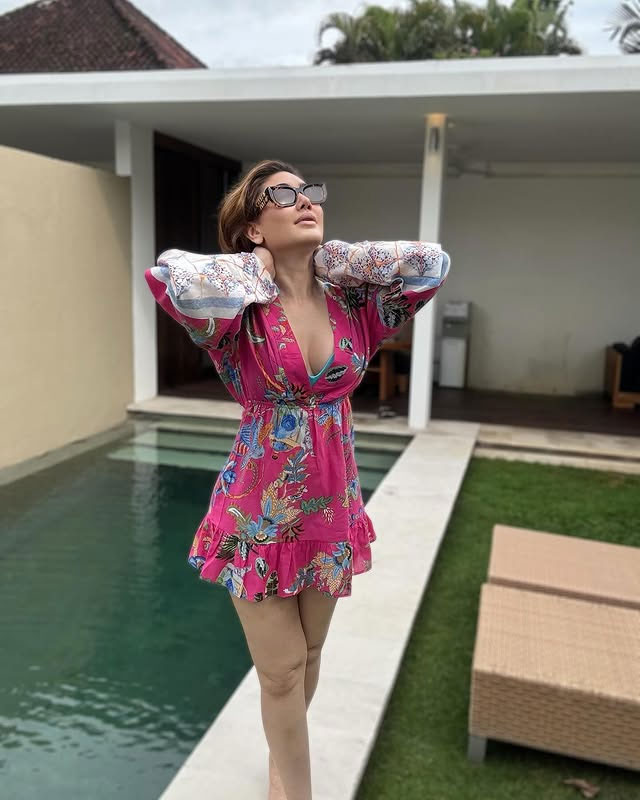 Shefali Jariwala recently shared a picture by the poolside. She wore a floral pink dress with blue details.