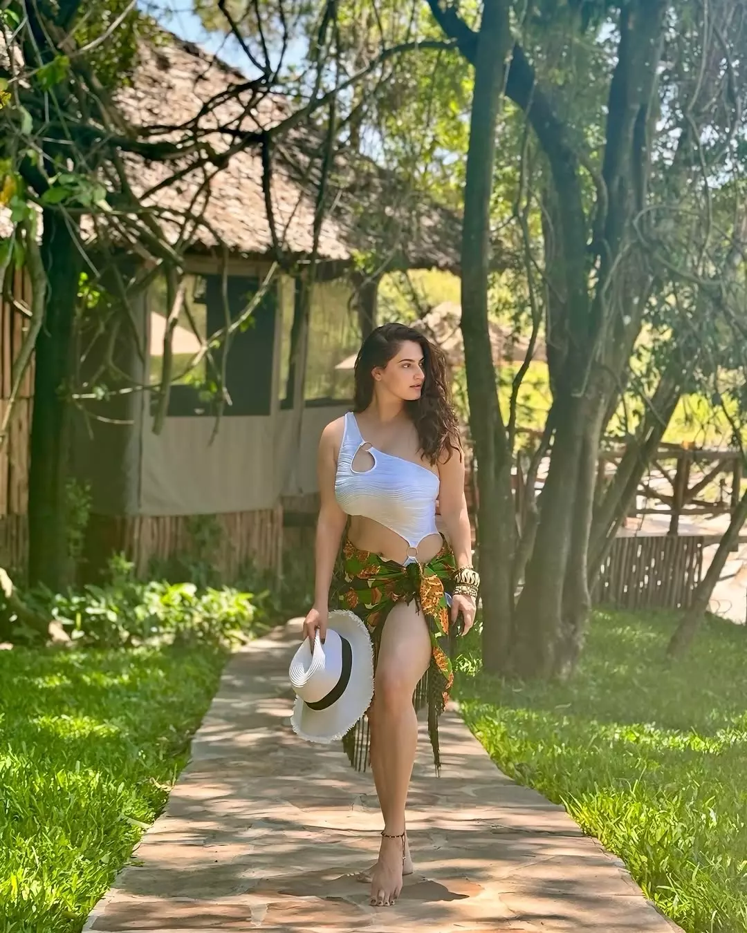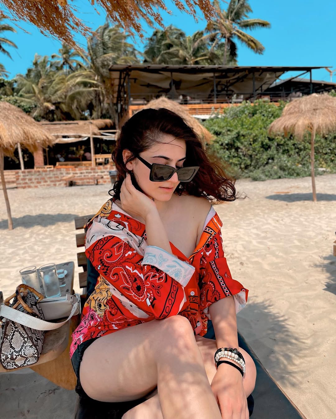 The vibrant photo captures Shivaleeka's radiant confidence on a serene beach getaway. Lounging on a wooden boat against turquoise waters and dramatic limestone cliffs, she wears a chic white cover-up dress over a leopard-print swimsuit, oversized white sunglasses, and windswept long hair. Her joyful smile and relaxed pose exude effortless glamour, tropical vibes, and sun-kissed allure in this stunning seaside snapshot.