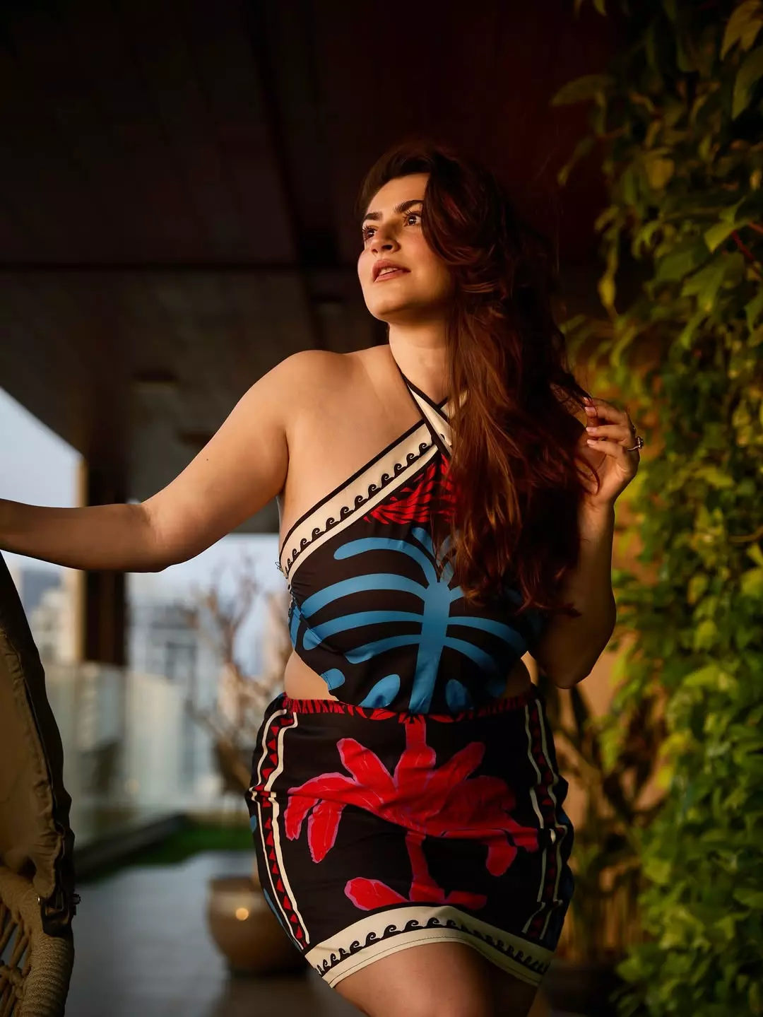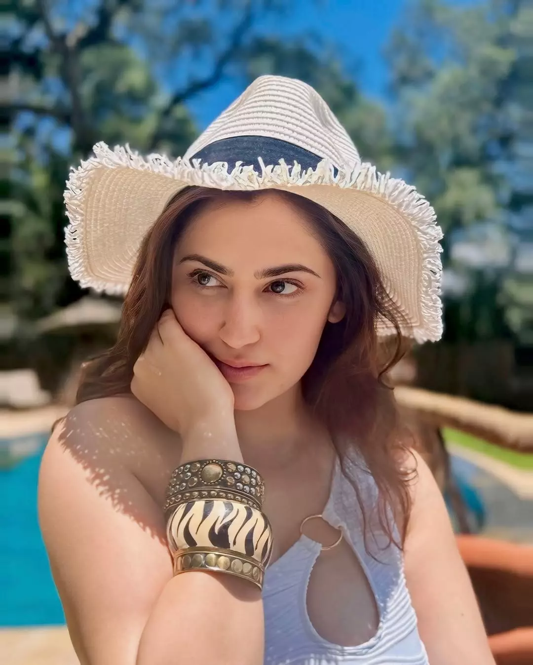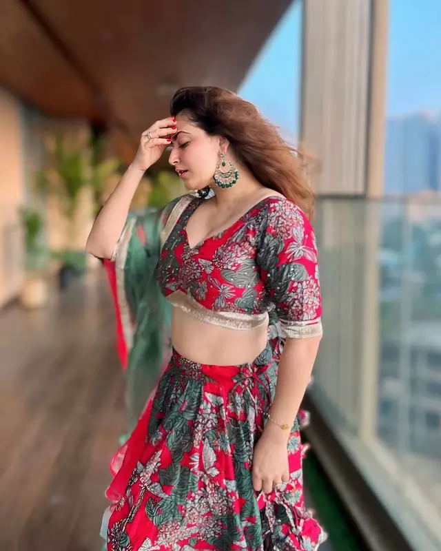 In her newest Instagram photos, Shivaleeka stuns in a striking red backless dress that perfectly accentuates her elegance and confidence. The blend of sandy hues and tropical patterns in the frame beautifully complements her radiant charm. With subtle hoop earrings and vibrant, multi-colored nails, she keeps her look effortlessly chic yet bold.