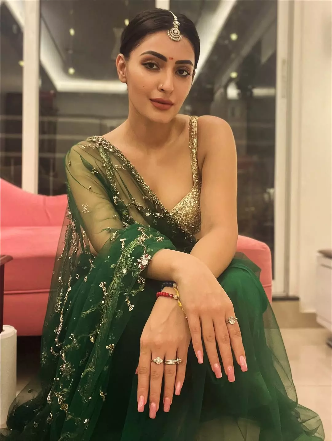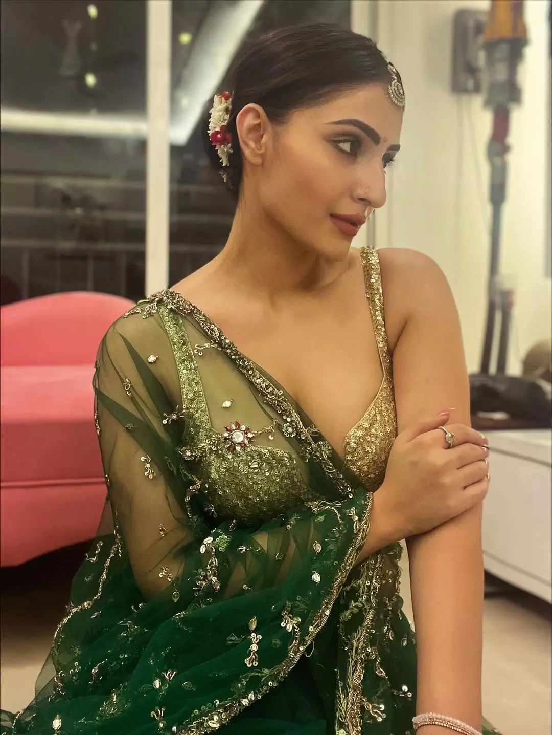 The actress is seen wearing a Green Saree which has multi color Green Golden Chumki Blouse sleeveless and deep enough to showcase her glamorous assets. She looks extremely stylish as well as unique in this Saree. There are a lot of positive comments to the Saree where people are praising her attire.