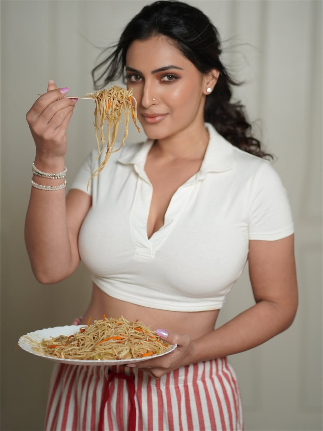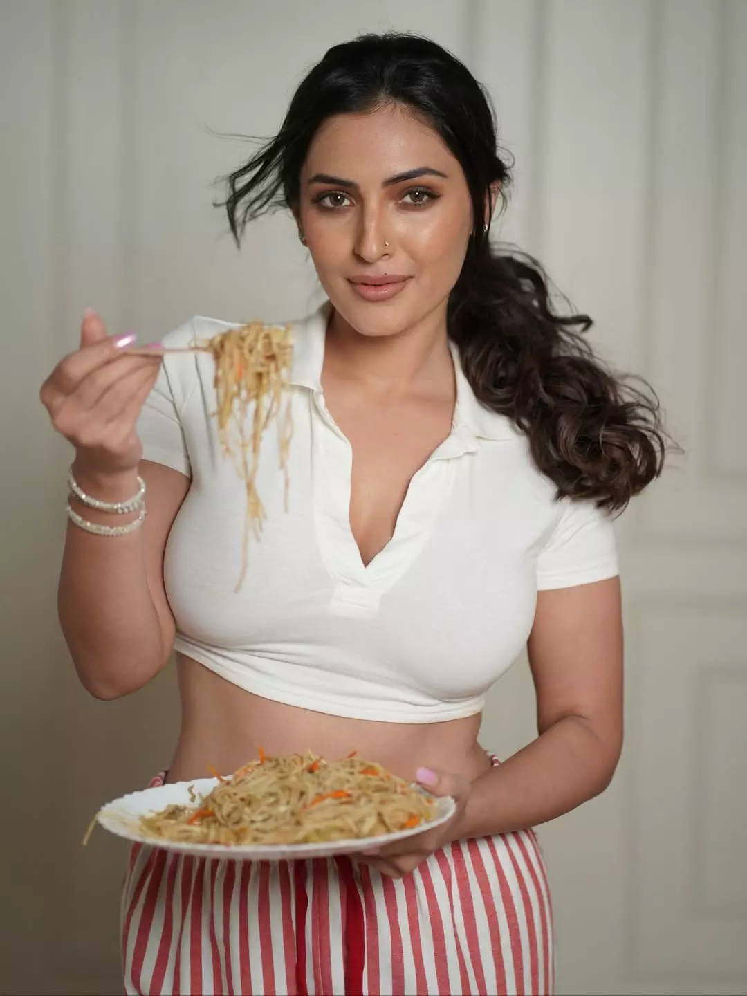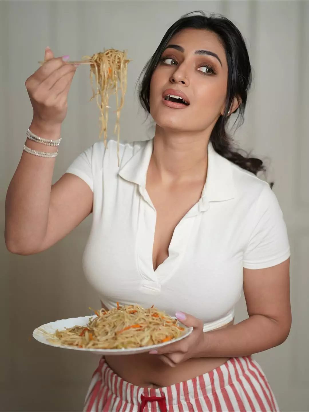 Shivangi Verma twirls golden noodles mid-air, white crop polo plunging low while red-white stripes hug her hips like candy cane sin. Fork poised, smirk loaded—she’s serving heat with every slurp. Long, soft, and makes you slurp… what am I?—the Chand Jalne Laga temptress just made lunch look lethal.