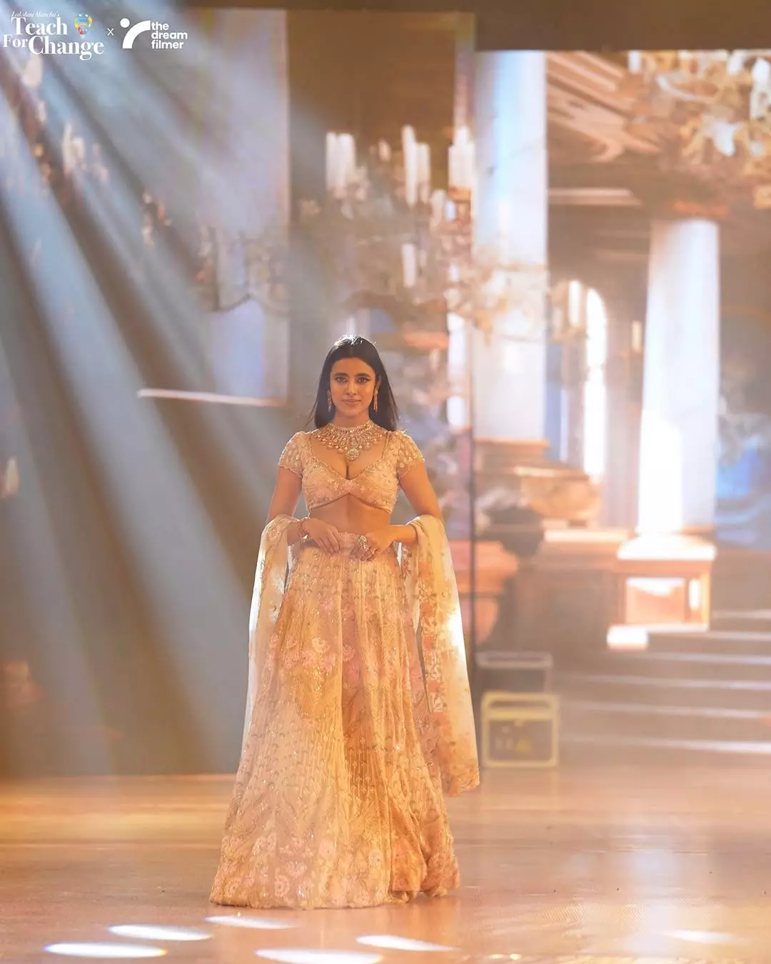 Shivani Nagaram dazzles in this stunning photo from a Glittz and Glam kinda night , radiating elegance and charm on what appears to be a fashion runway. Clad in an intricately embroidered peach lehenga with delicate floral patterns, she pairs it with a matching blouse and a flowing dupatta, accentuated by lavish gold jewelry that catches the spotlight. Her poised stance and subtle smile against the warm, blurred audience backdrop highlight her commanding presence, making this a perfect embodiment of festive glamour and sophistication.
