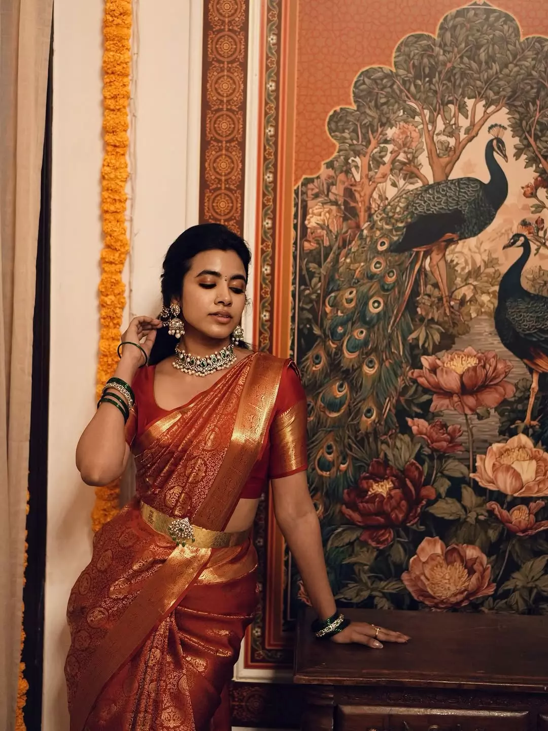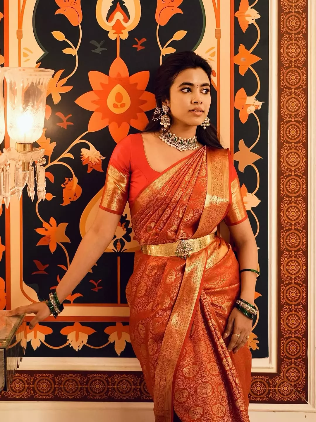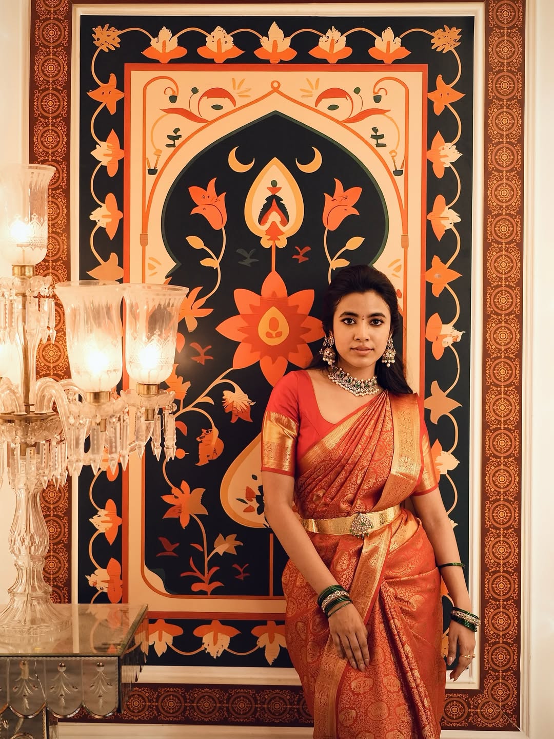 She wears a bright orange-red silk saree that shines gently in the light. The golden border and weaving give it a regal touch, bringing out the richness of traditional craftsmanship. The matching blouse adds balance, making the entire outfit look clean and graceful. A golden waist belt adds a polished finish and highlights the structure of her drape. The styling by bharathgandhiofficial.