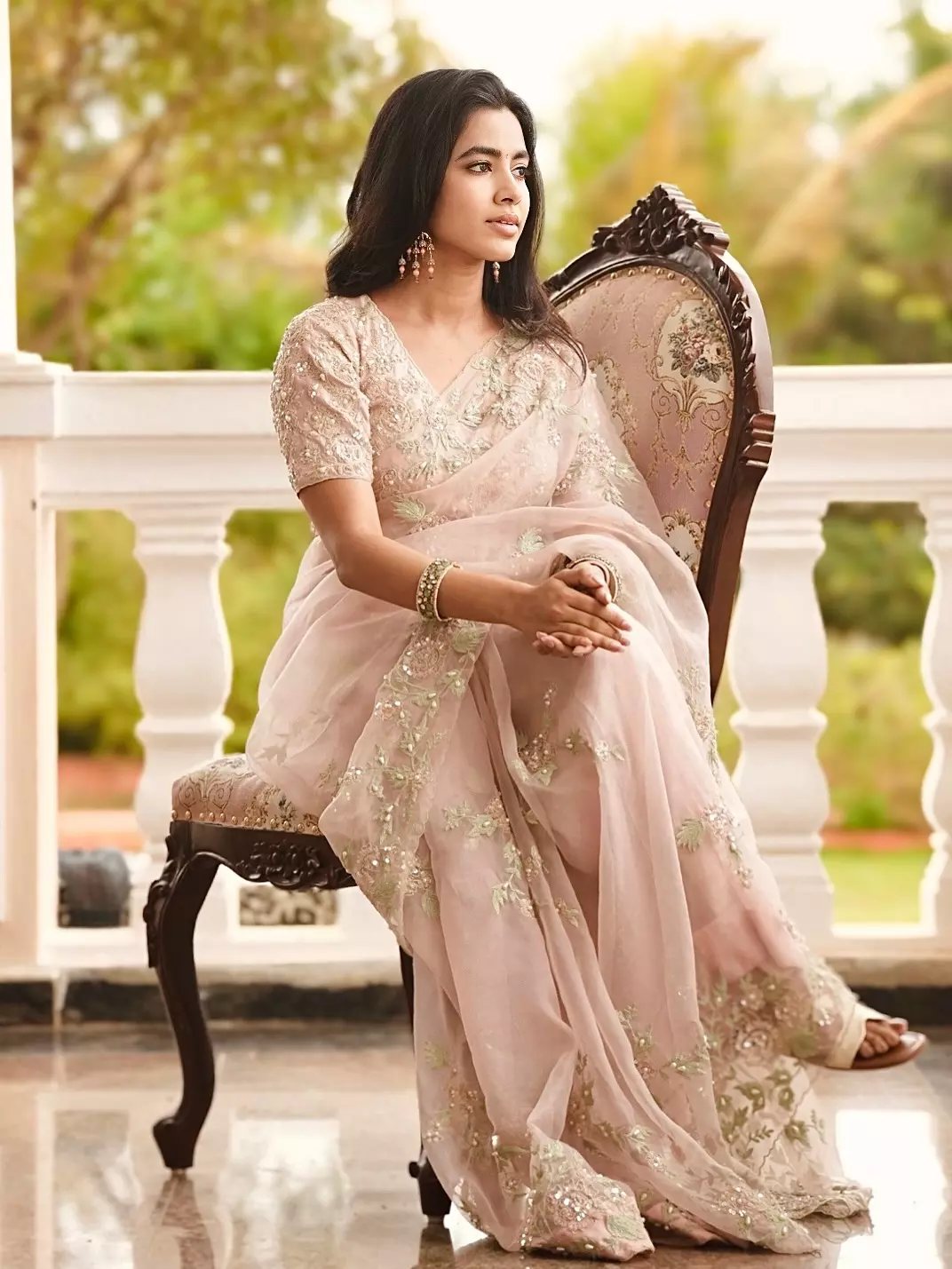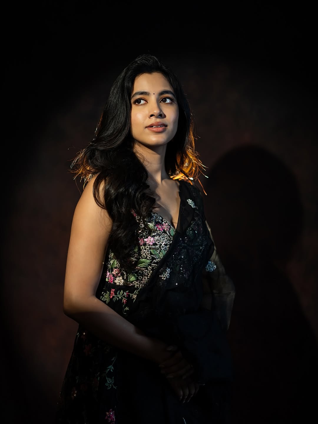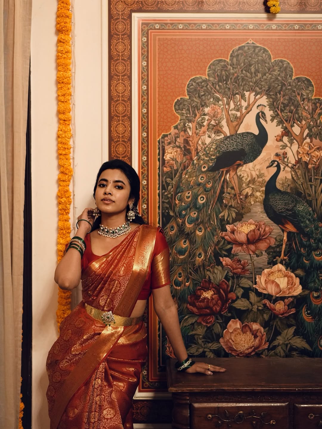 The picture is beautifully captured by vijayraccha, who uses warm lighting to highlight the saree’s texture and the backdrop’s details.
