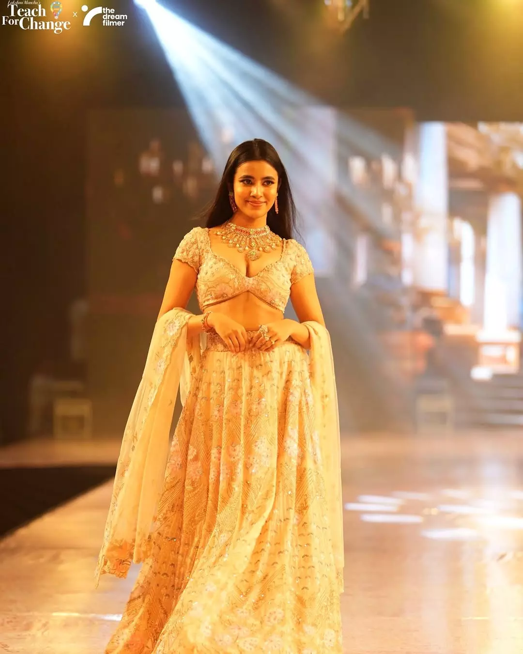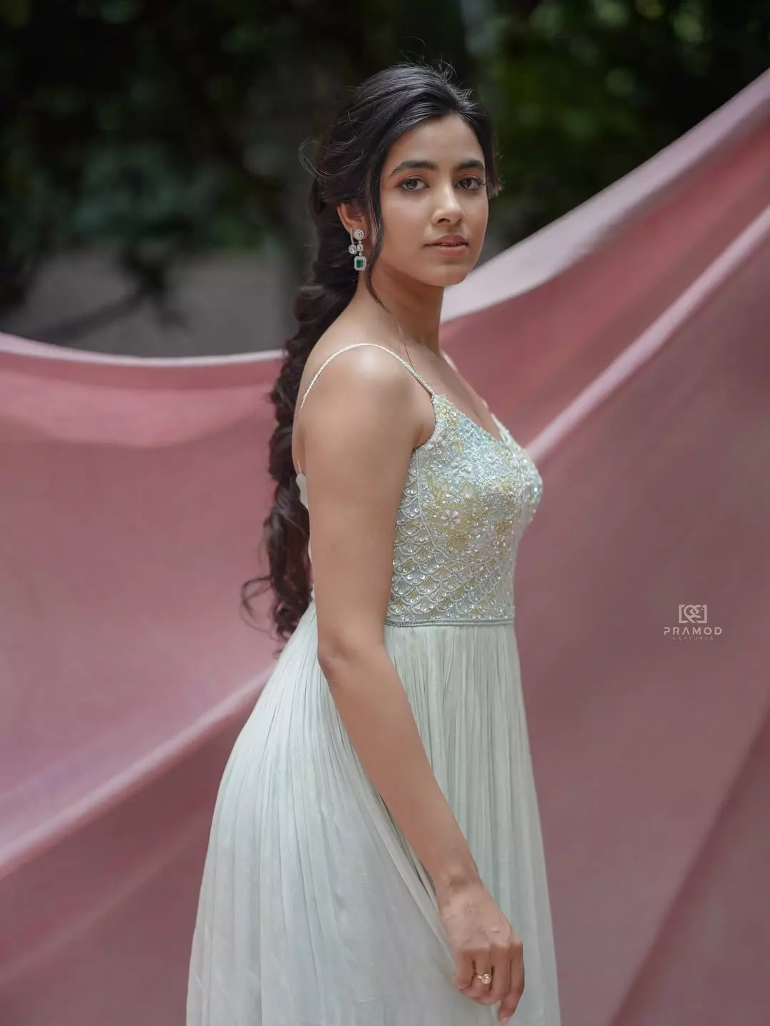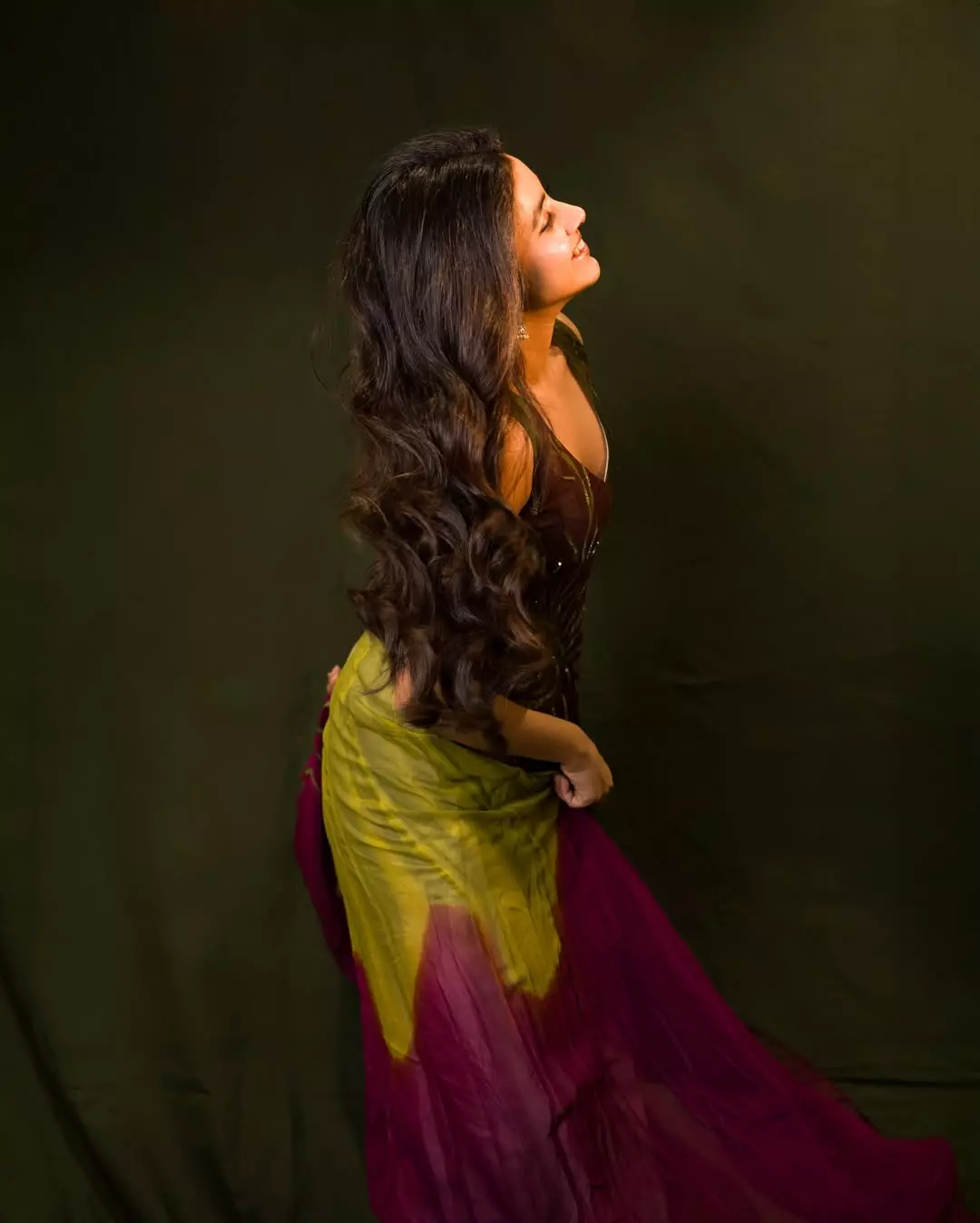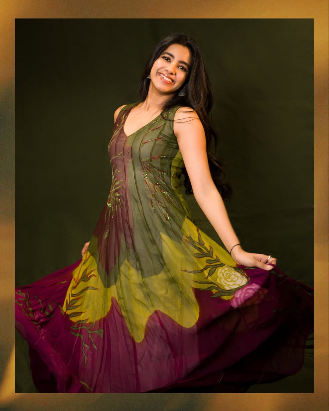 By: Tupaki Gallery Desk | 10 March 2026 9:58 AM ISTShivani Nagaram, the promising Telugu actress, enchants once again in this captivating studio photoshoot. She twirls with effortless grace in a stunning sheer green and maroon gown featuring intricate golden embroidery, floral patterns, and a flowing multi-hued skirt that captures movement and vibrancy. Her long wavy hair flows dramatically, paired with a joyful smile and subtle jewellery, creating an ethereal, dreamy aura against the dark backdrop.