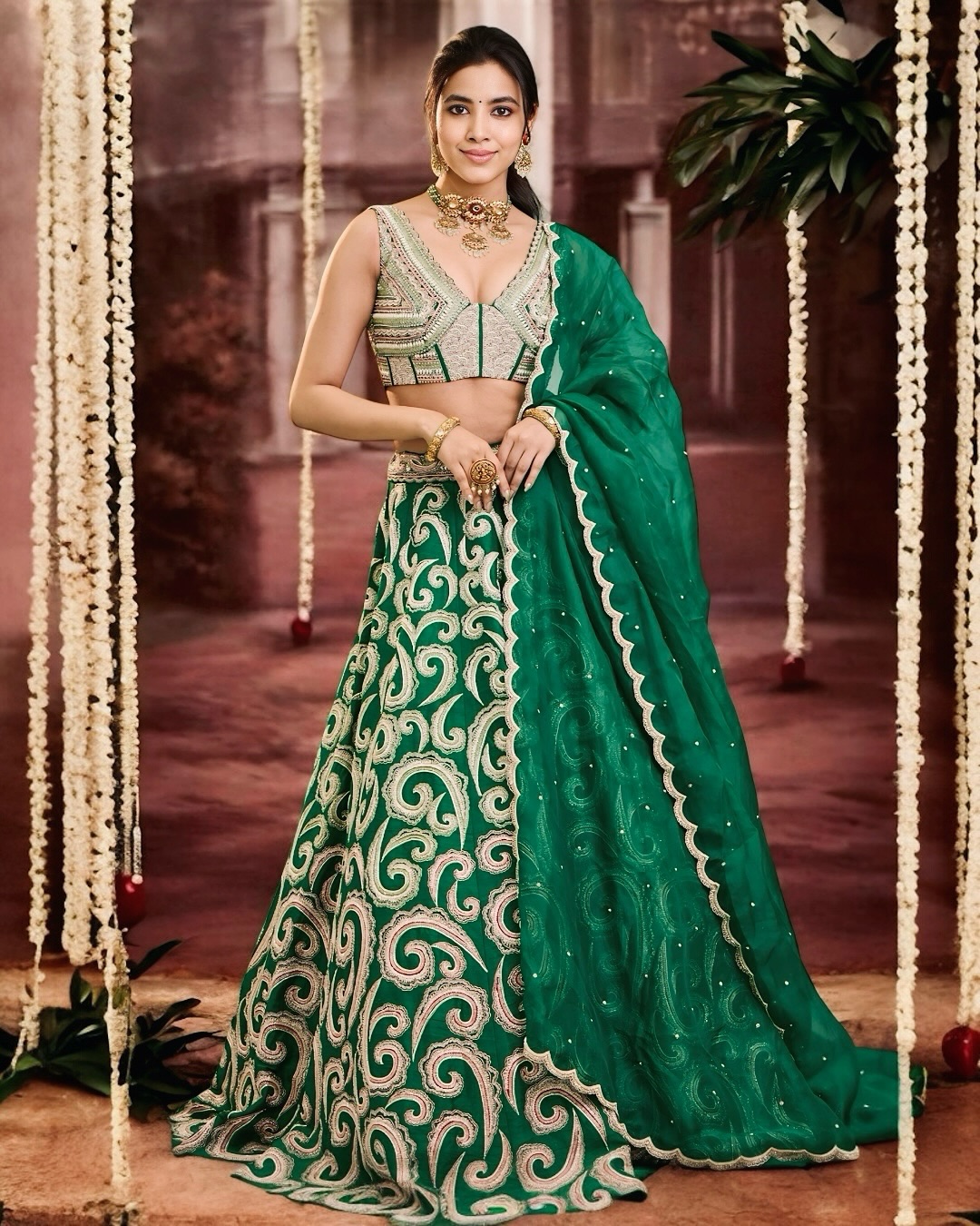 She twirls with effortless grace in a stunning sheer green and maroon gown featuring intricate golden embroidery, floral patterns, and a flowing multi-hued skirt that captures movement and vibrancy.