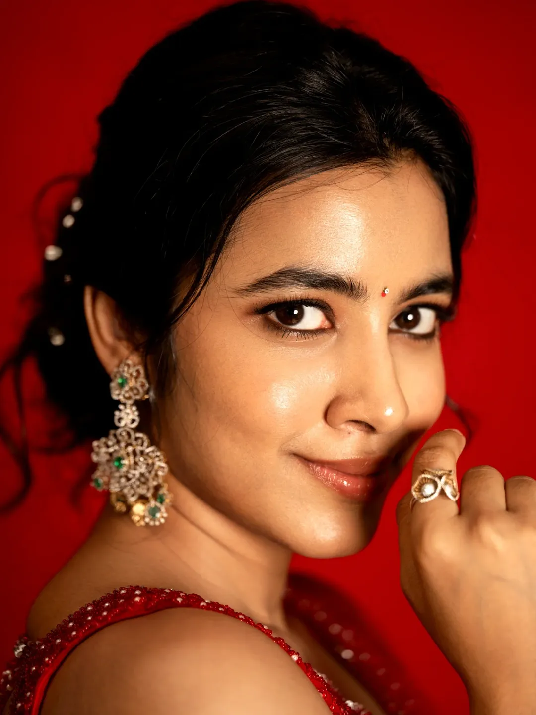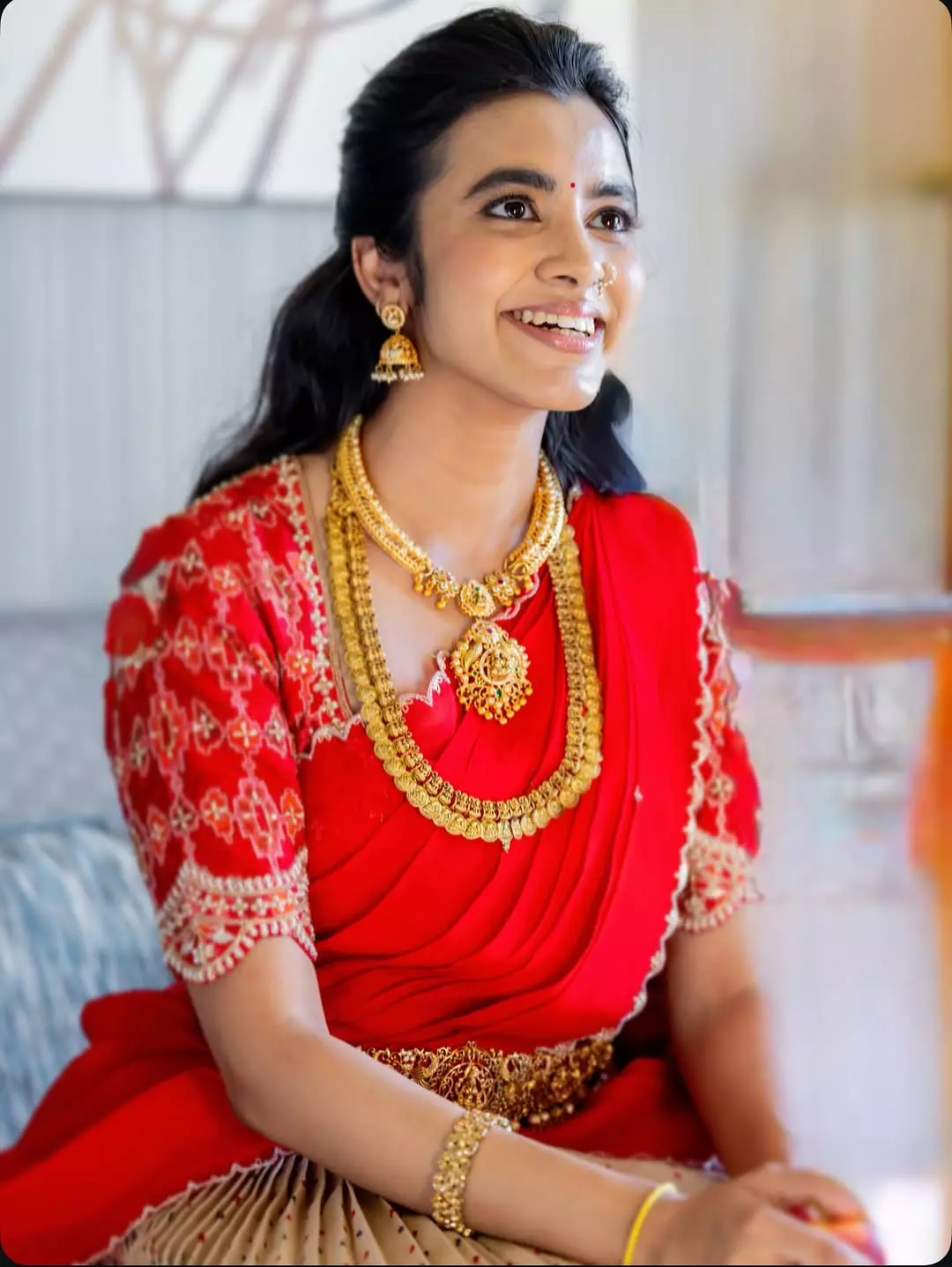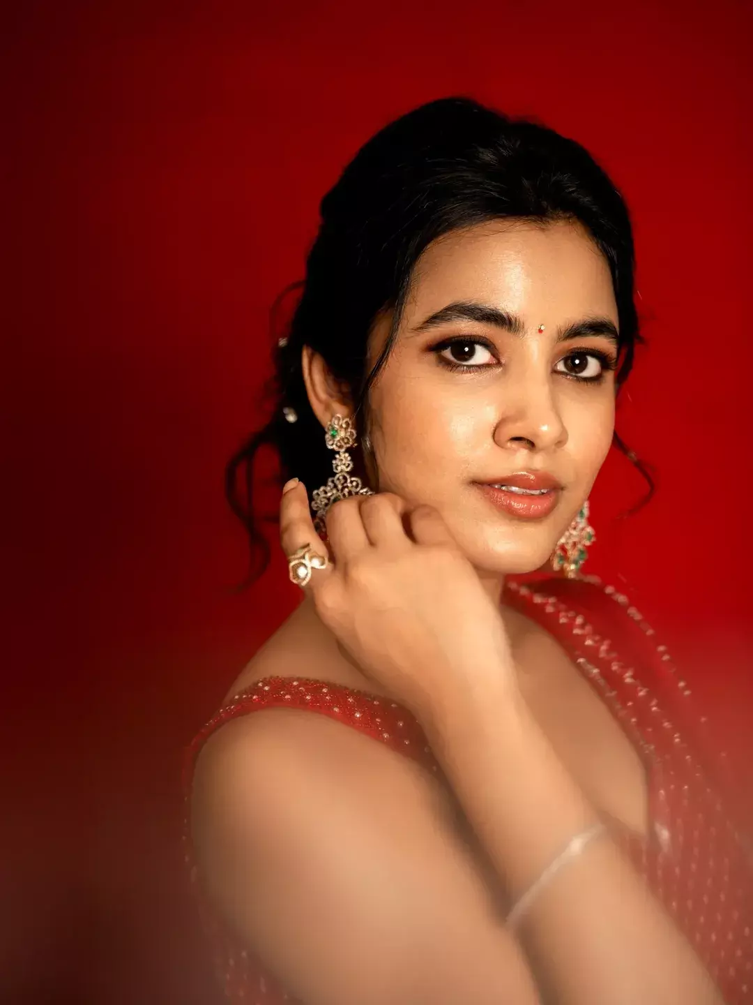 In this picture, Shivani wore a deep red saree designed by Lepakshi Designer Studio. The dress featured subtle beadwork and a beautifully draped pallu that enhanced her overall look. Her styling was done by Sree Devi Tetali and Sindhuja Dasari and Shivani chose jewellery from Pinaki Jewellers.