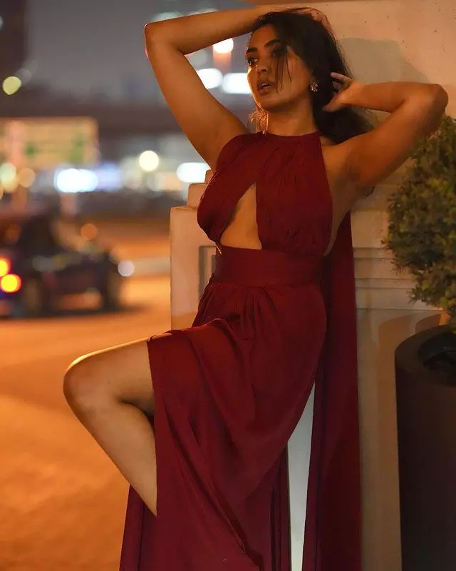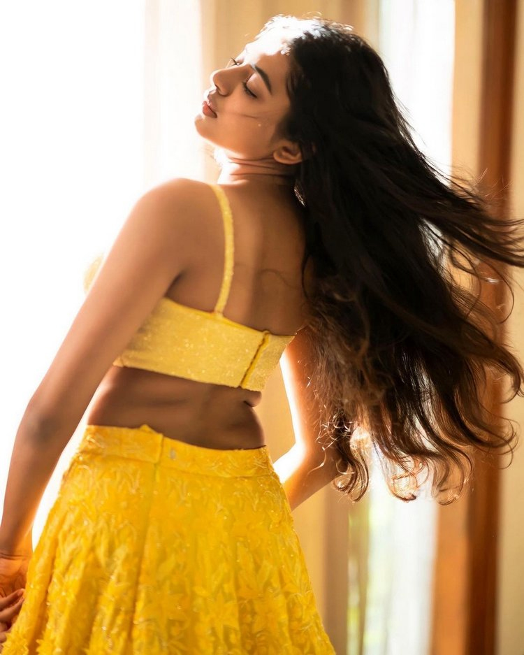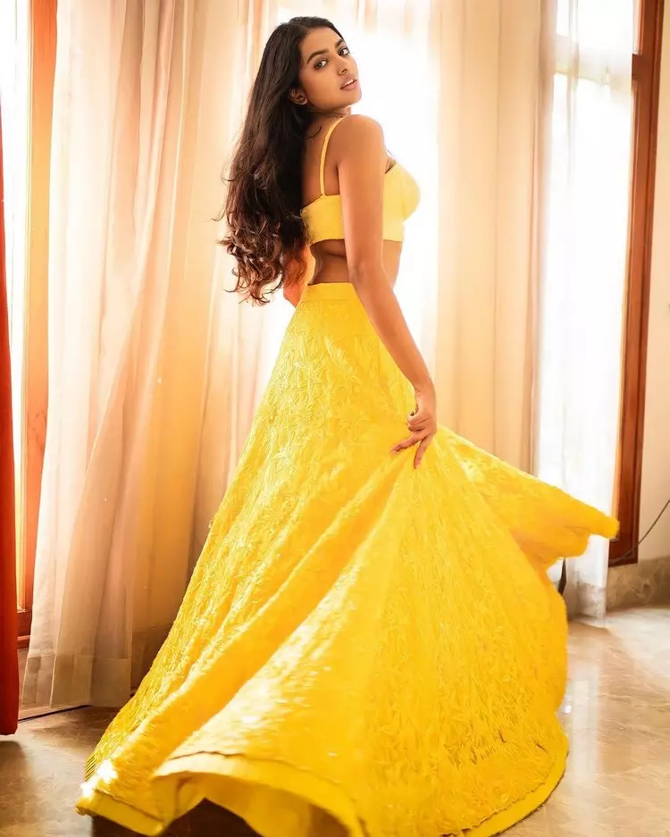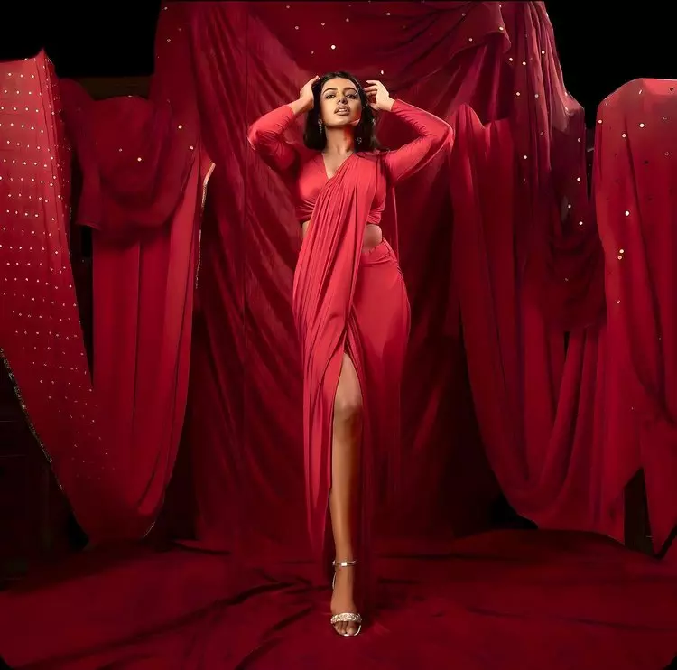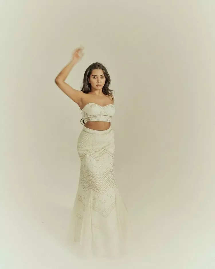 Draped in a deep brown ensemble, Shivathmika Rajashekar radiates a blend of modern elegance and classic charm. The rich, earthy shade perfectly harmonizes with her warm skin tone, while the sleek, understated cut of the dress enhances her natural poise. Soft, cascading waves frame her face, and her choice of subtle accessories allows her innate sophistication to take center stage. With a calm demeanor and assur