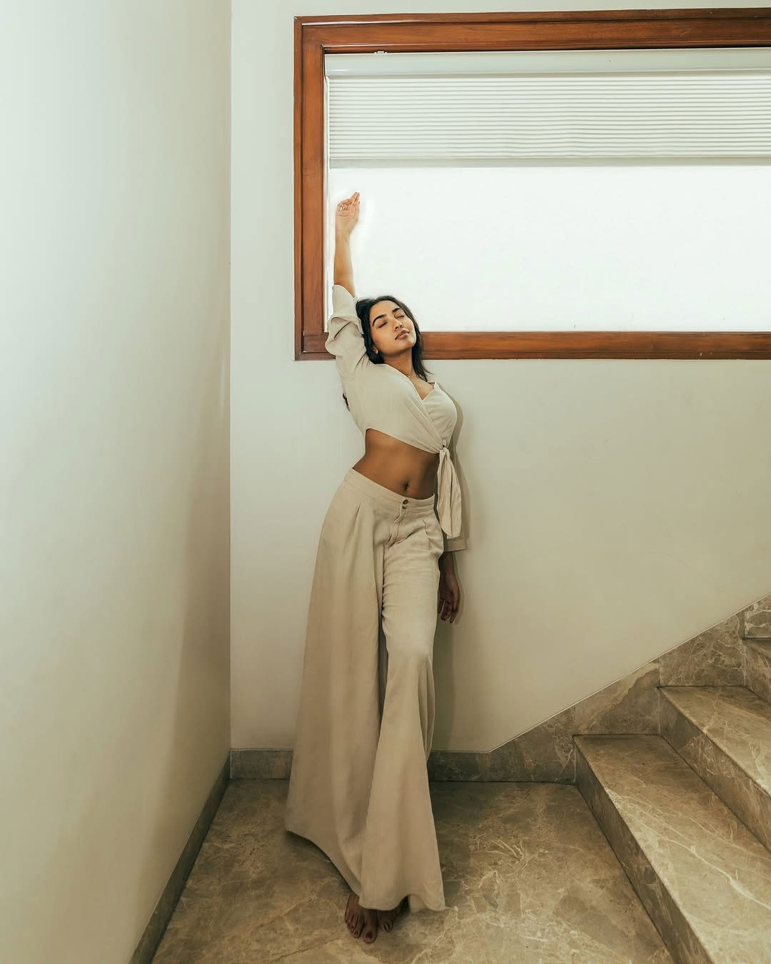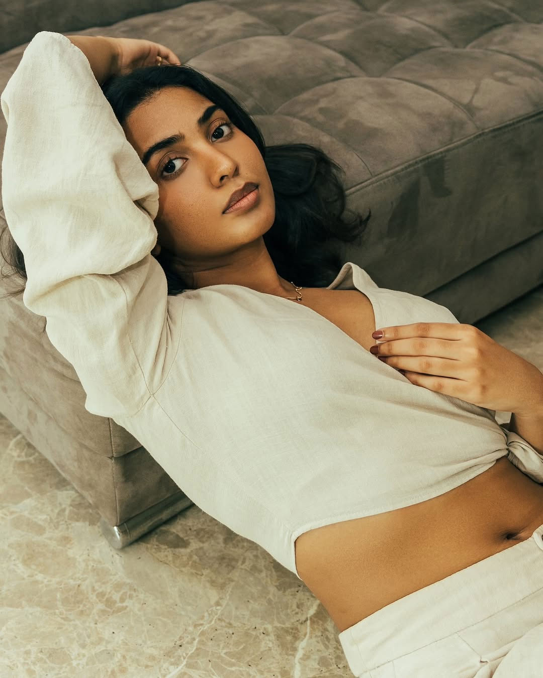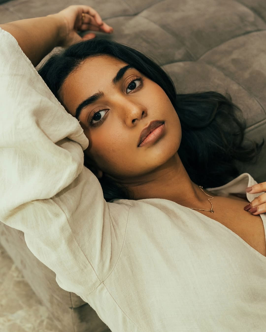 By: Tupaki Desk | 27 May 2025 10:45 PM ISTShivathmika Rajashekar was seen in a calm and grounded mood leaning against a cozy couch. She is seen dressed in a light cream ensemble. The natural tones of her look matched perfectly with the marble floor and soft brown background, giving a relaxed vibe. Shivathmika looked directly at the camera, with her arm resting behind her head and a peaceful expression on her face.