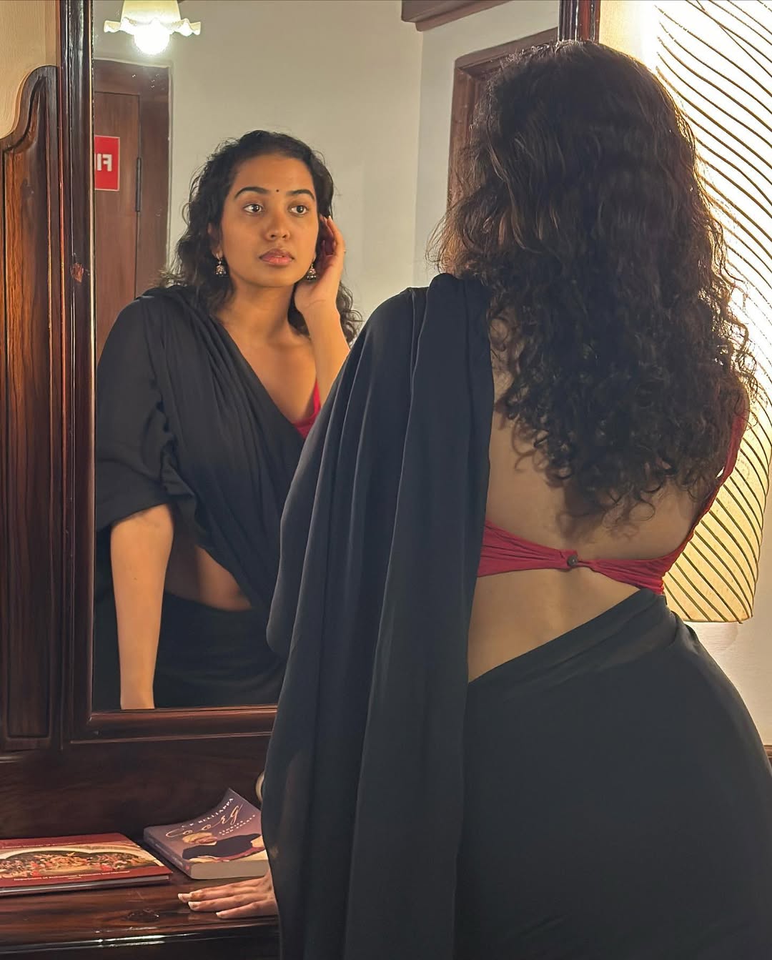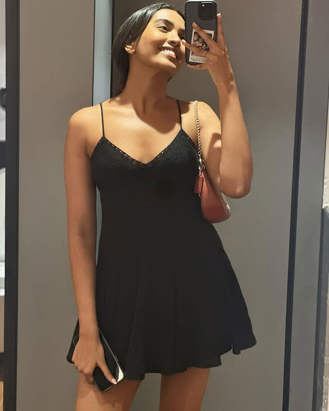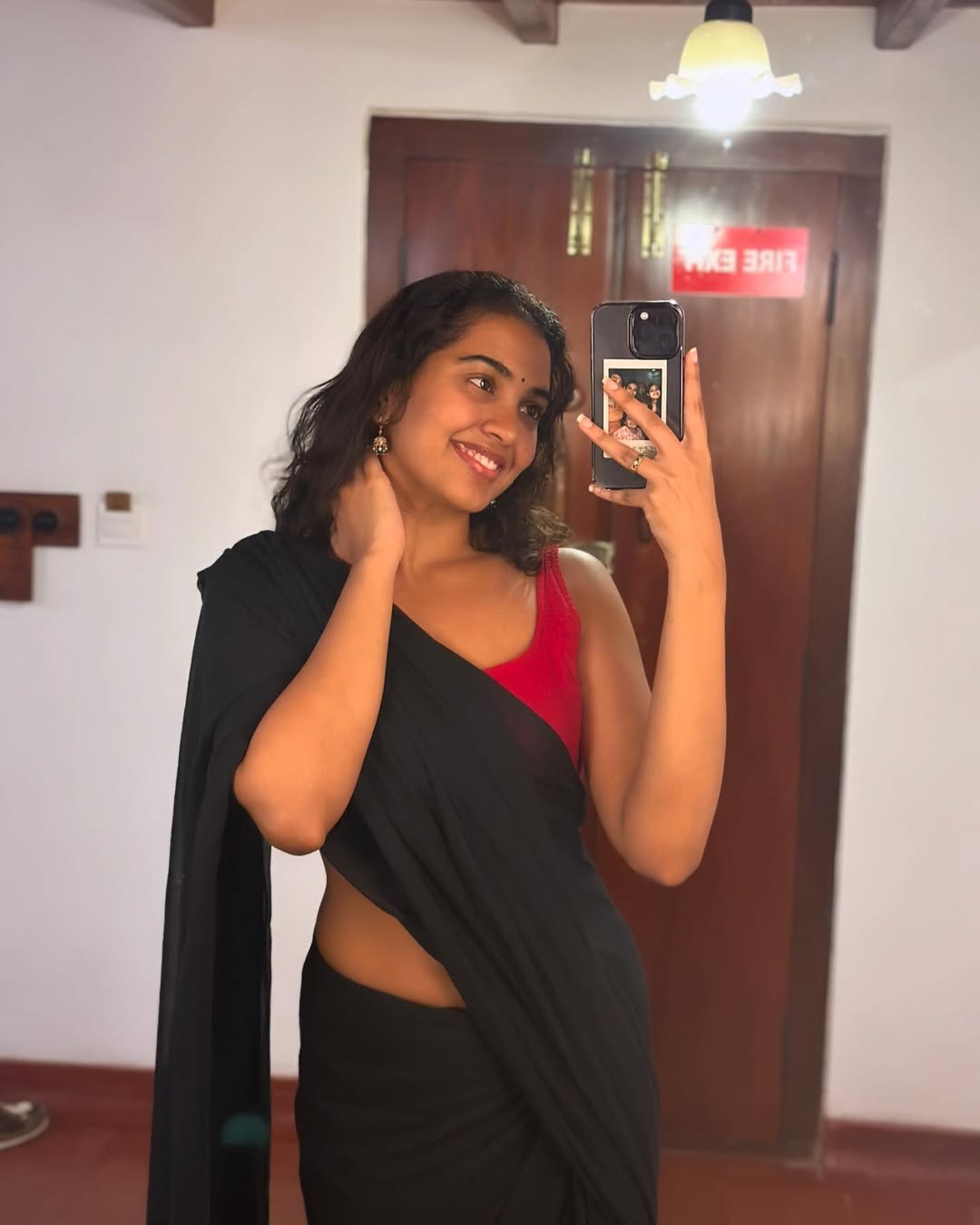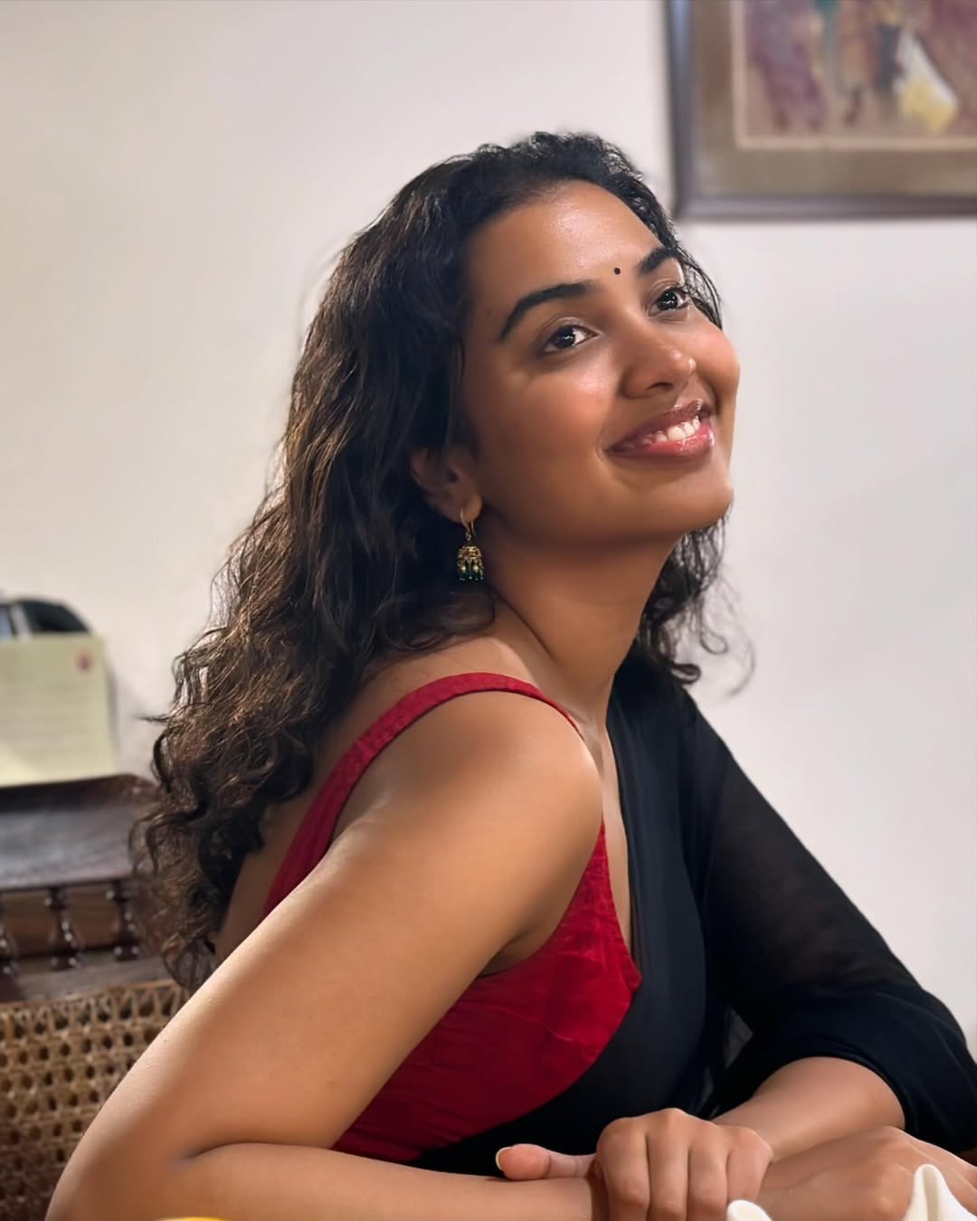 On Instagram, Shivathmika gives her followers a glimpse into her world—whether it’s candid family moments, snippets from shoots, or relaxed, intimate portraits. In one such recent post, she keeps things simple and stunning in a black lace-trimmed cami top. Styled with soft waves and a serene expression, the look is understated yet striking—just like her.