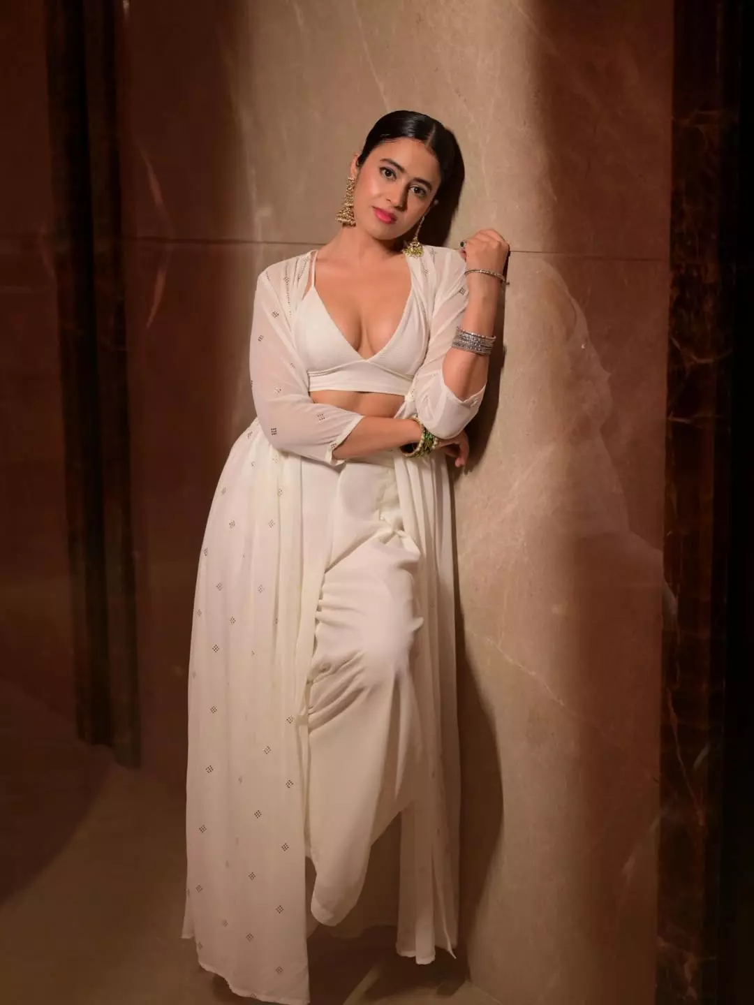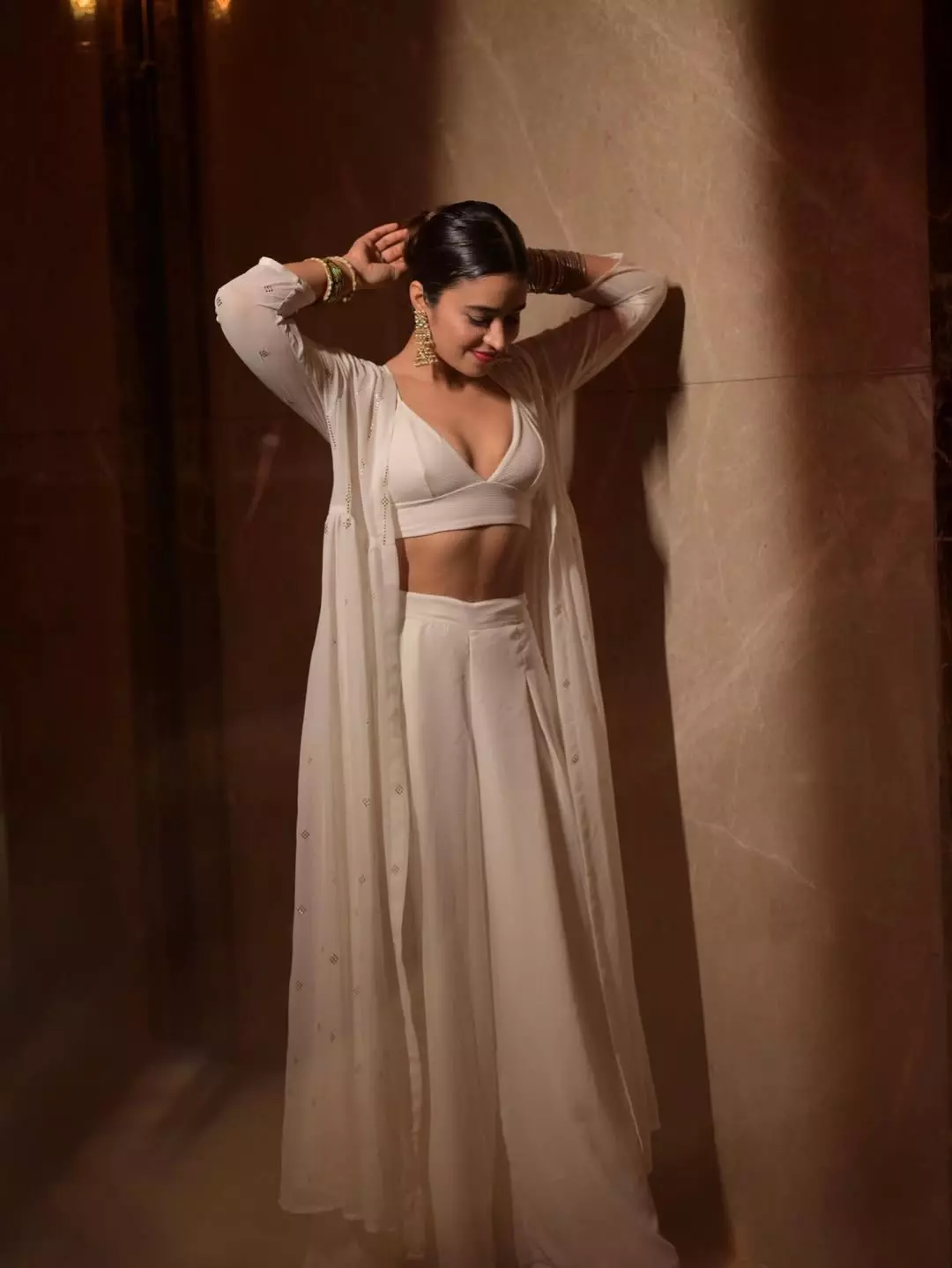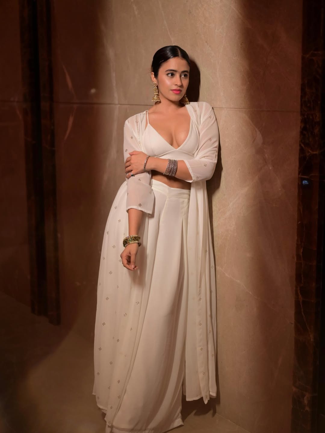 By: Tupaki Gallery Desk | 15 April 2026 3:26 PM ISTShobhita Rana, the Chandigarh-born beauty with a magnetic screen presence, continues to enchant fans with her poised glamour. In this stunning portrait, she exudes sophistication in a figure-flattering white crop top paired with a sheer, embellished shrug and matching bottoms. With sleek pulled-back hair, statement gold jhumkas, and delicate bangles, Shobhita leans gracefully against a textured wall, her sharp gaze and soft pink lips adding quiet confidence to the frame.