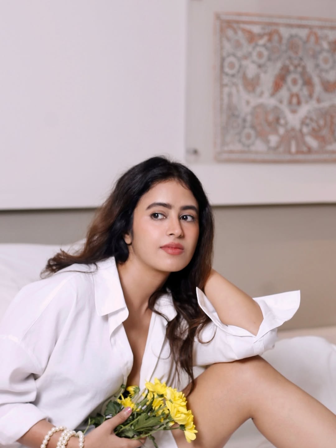 In the photo, she is seen sitting comfortably on a bed dressed in a loose white shirt. She holds a small bunch of yellow flowers close to her face.
