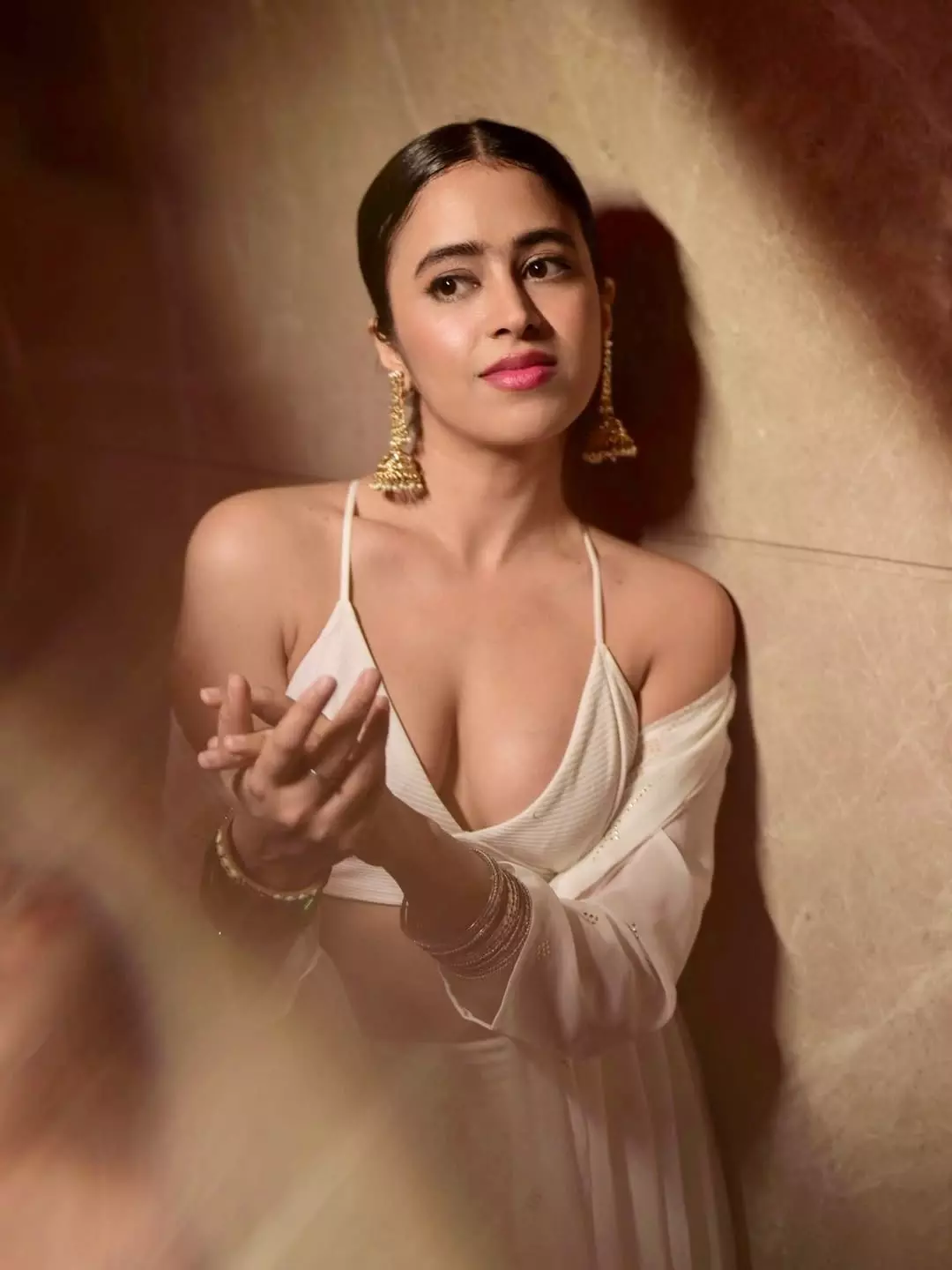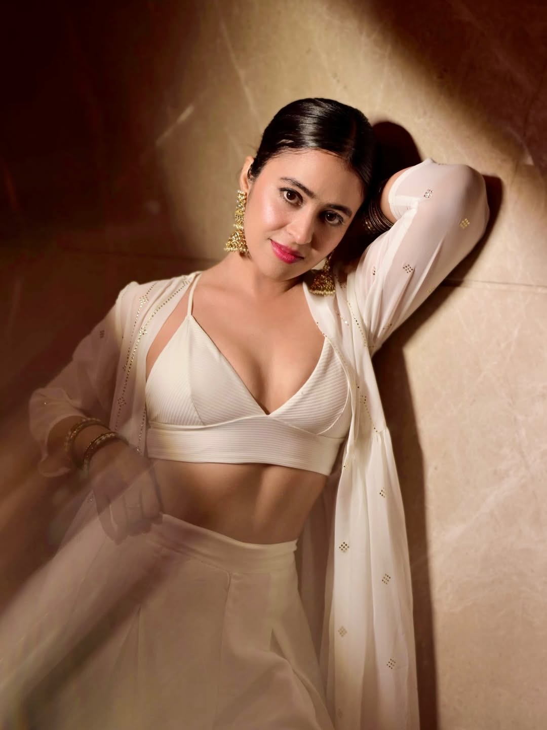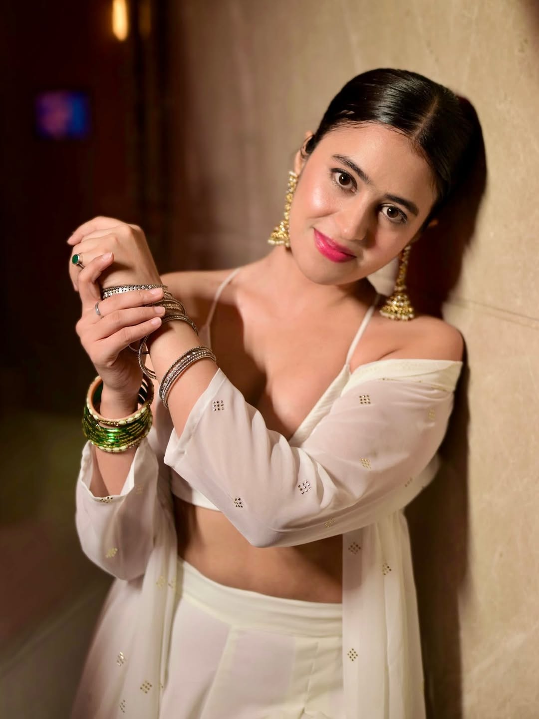 Recently, she shared some of her stunning pictures on Instagram contemporary outfit, which mixes both traditional and modern styles. Wearing a white bralette-style blouse and a high-waisted white skirt, Shobita looks alluring in these pictures. She opted for minimal makeup and minimal jewellery, which includes only bangles and jhumkas. Shobita looks stunning in these charismatic poses, making these photos viral on social media.