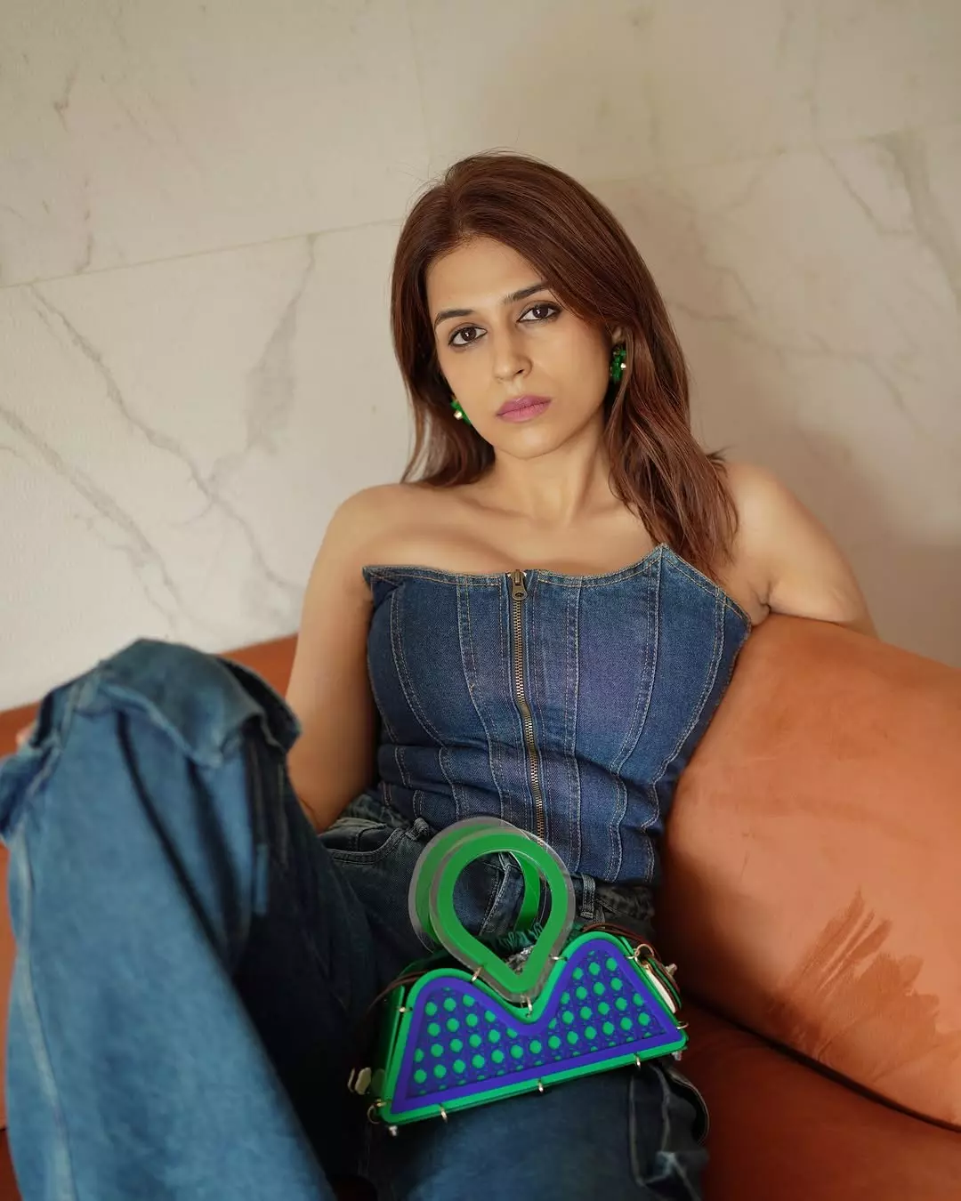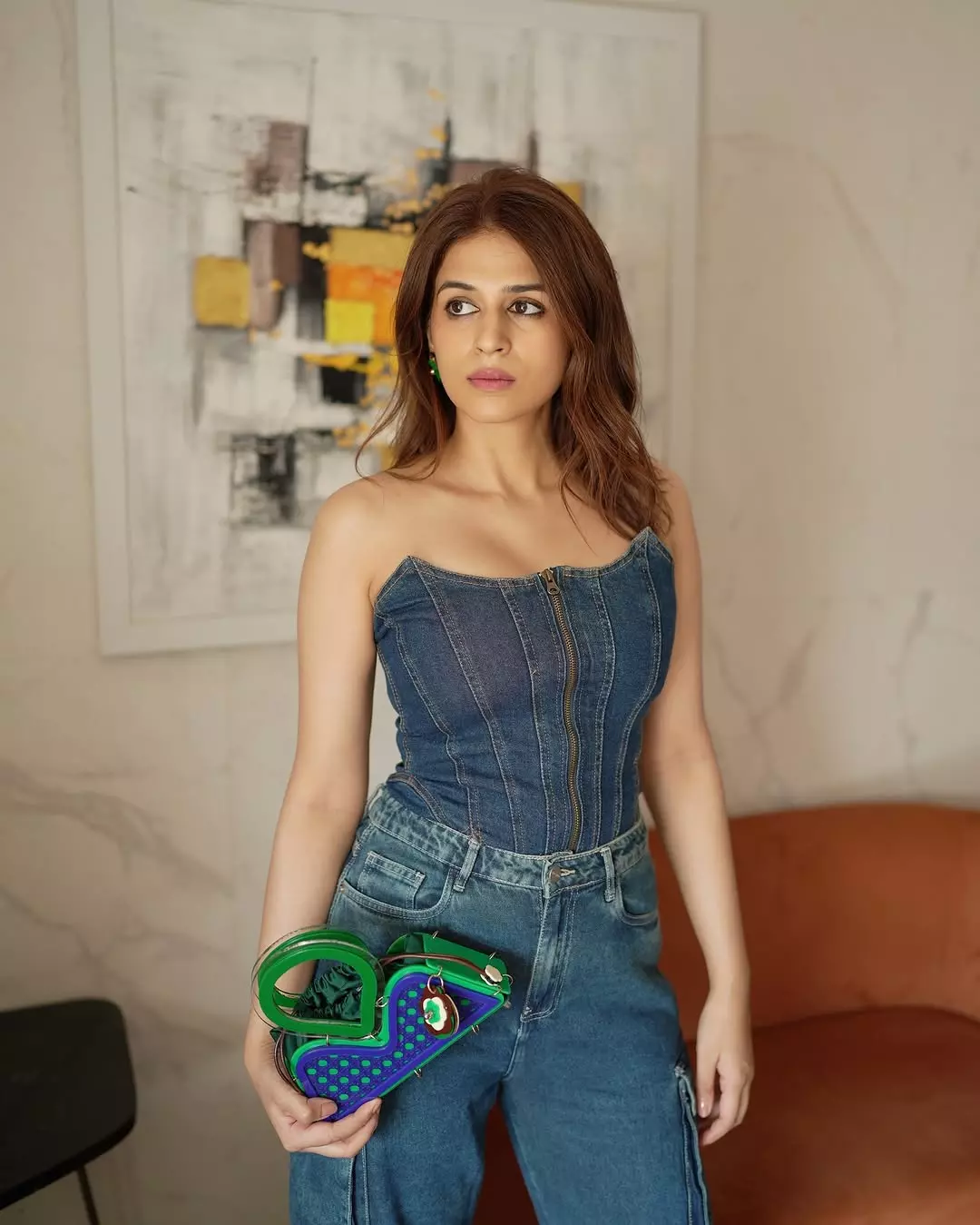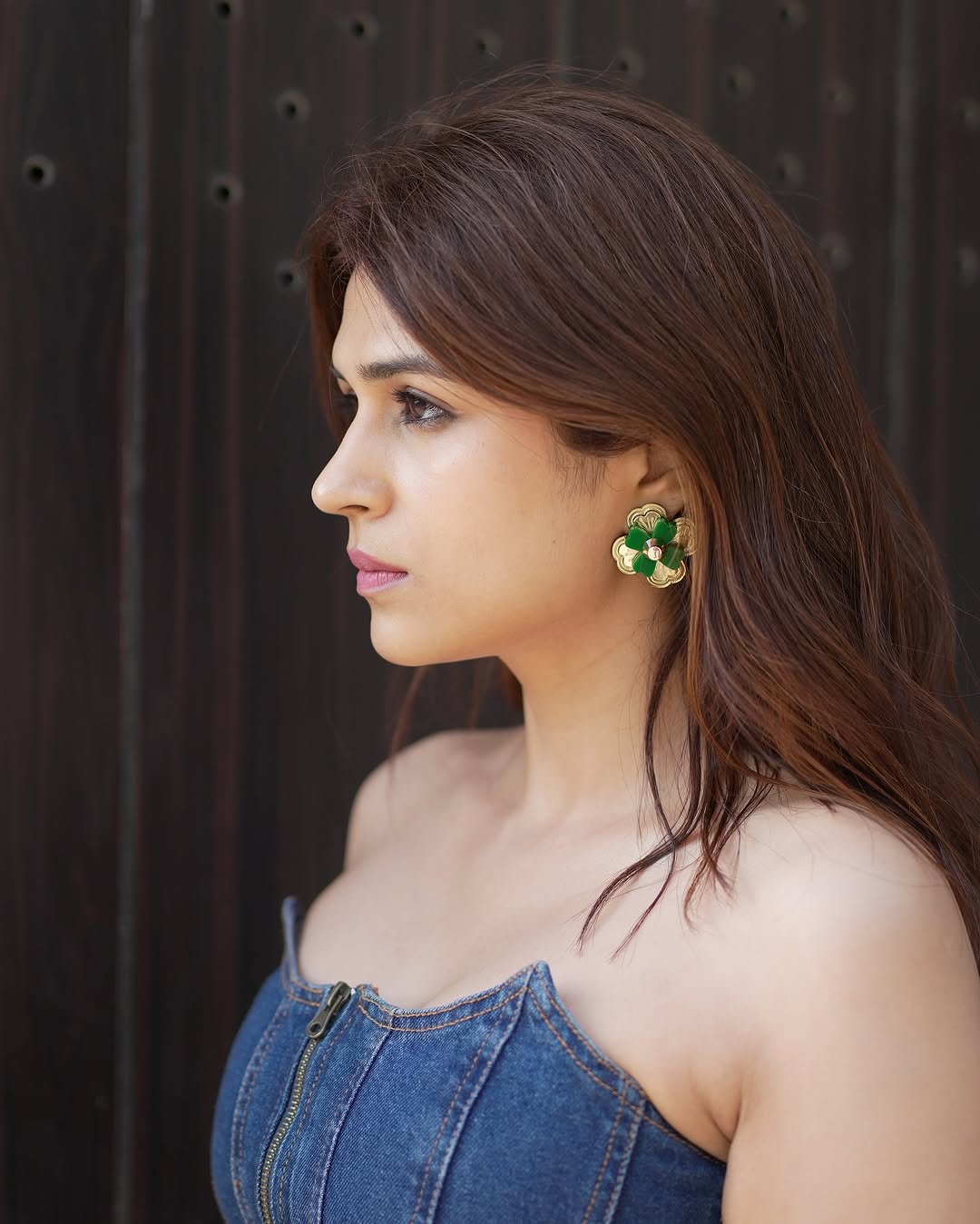 In her recent Instagram post, she wears a denim top with a zipper. She pairs it with matching jeans. She accessorizes with a stylish bag and earrings from the_yvbrand. Her green earrings add a pop of color to her look. shotbysakar captured this moment beautifully. She credits freakinsindia for her top and jeans. She also mentions viralmantra for PR.