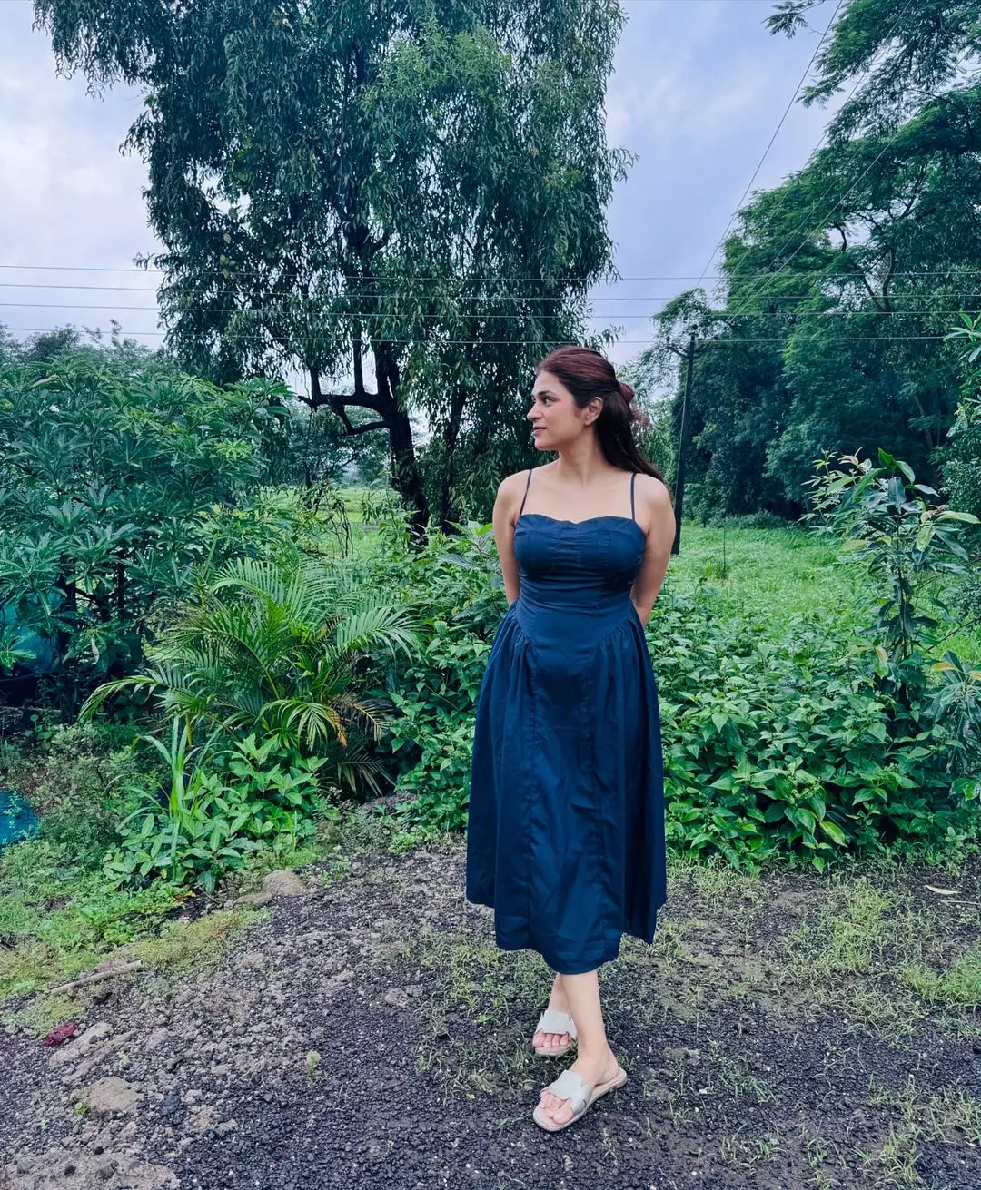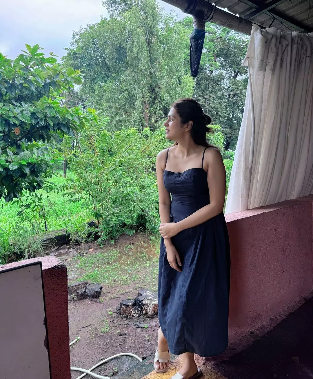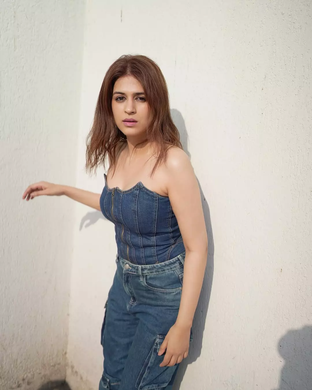 In her recent Instagram post, she wears a denim top with a zipper. She pairs it with matching jeans. She accessorizes with a stylish bag and earrings from the_yvbrand. Her green earrings add a pop of color to her look. shotbysakar captured this moment beautifully. She credits freakinsindia for her top and jeans. She also mentions viralmantra for PR.