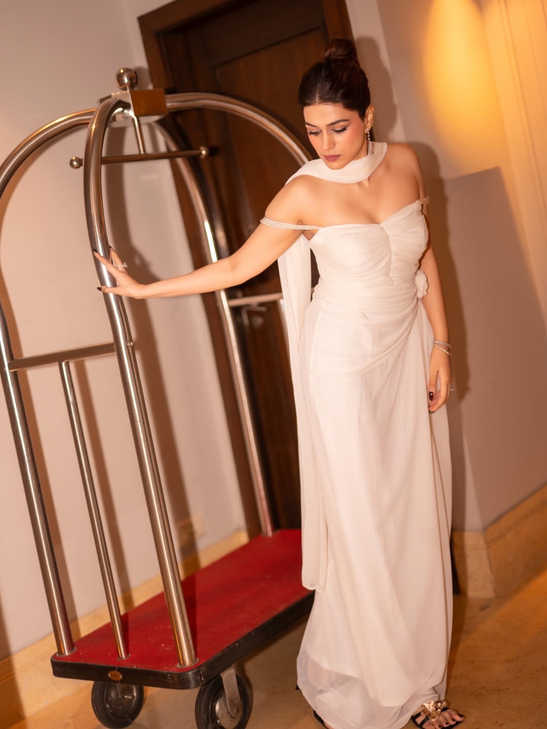 This stunning photo captures Shraddha in ethereal elegance — posing gracefully beside a luggage trolley in a flowing off-shoulder white gown with pearl details and a draped cape. Photo by @krishnatejah | Styled by @baharberii | Wearing @sotbella_in | Jewellery @sparklesdiamondjewellery | Accessories @konnecting.in | Outfit details @sana.k.official | Makeup @raashikashetty @raashikaa__| Hair @vaibhavimhapsekar — exuding sophistication and poise.