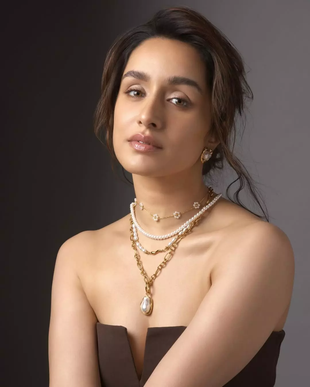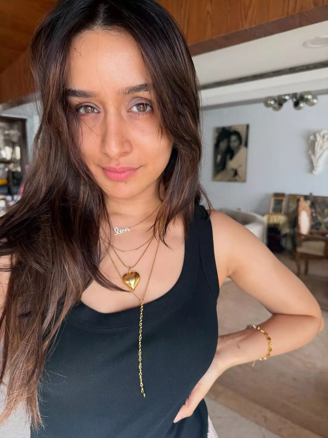 Bollywood actress Shraddha Kapoor exudes effortless charm and natural beauty in this stunning selfie. Dressed in a sleek black tank top and cream-colored pants, she flaunts a minimalistic yet chic look that radiates comfort and confidence. Her makeup-free face and relaxed pose highlight her glowing skin and authentic personality. The subtle elegance of her gold layered necklaces adds a perfect touch of style, drawing attention to her thoughtful choice of accessories.