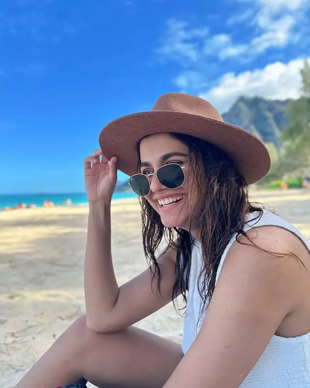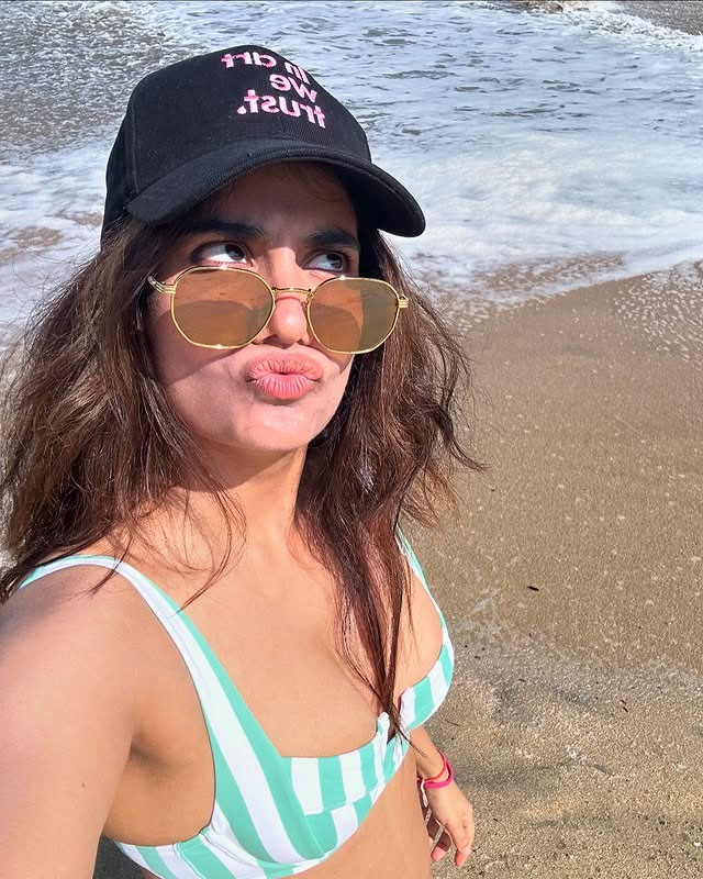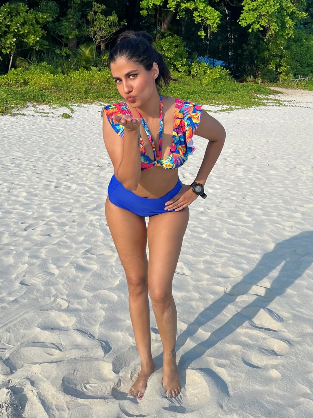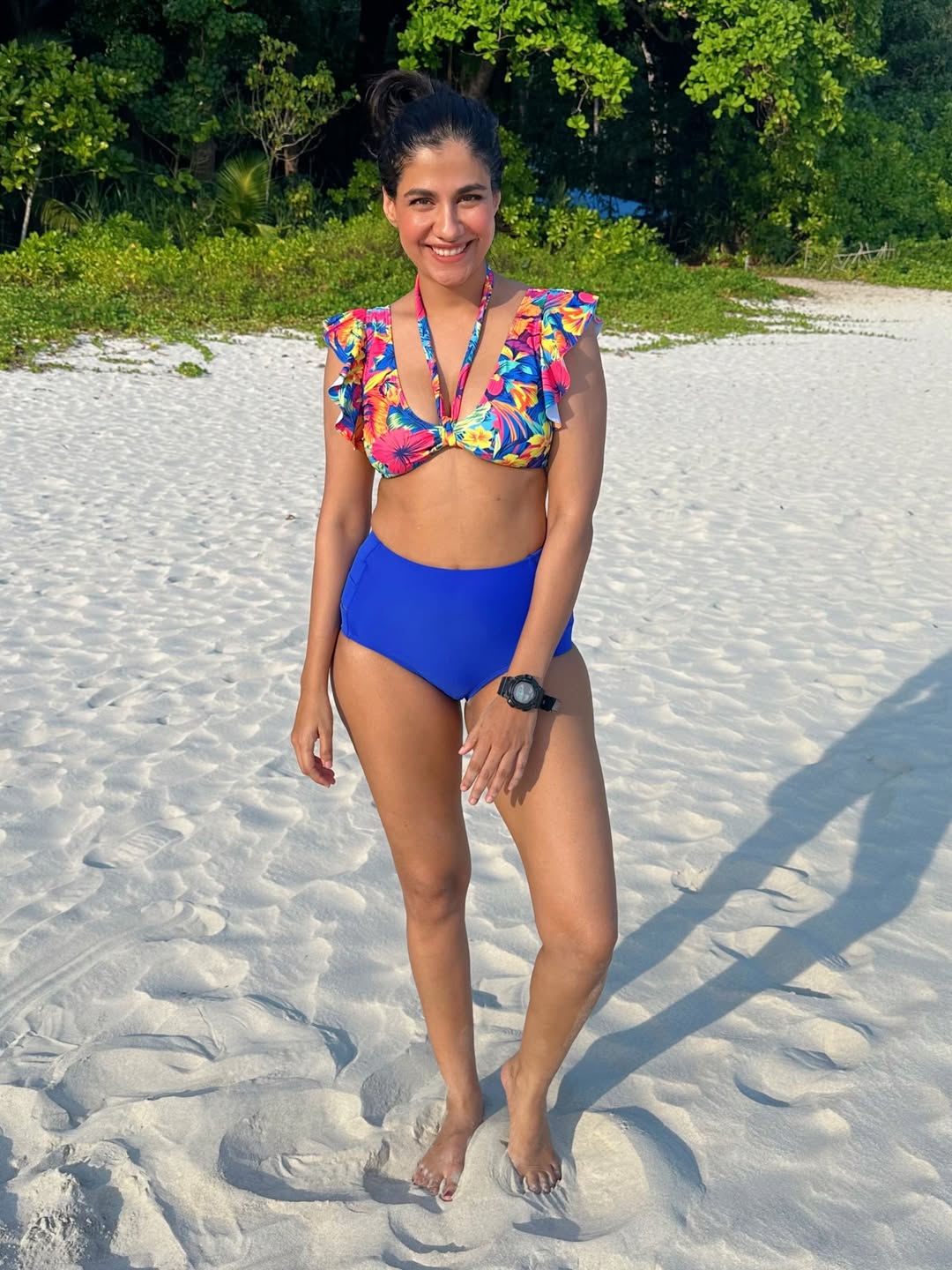 Shreya Dhanwanthary captivates once again in this stunning beach photo, radiating confidence and charm on the sandy shores. With her playful pout and the caption vibe of "One kiss is all it takes…", she sends a flirty, irresistible message that perfectly matches her vibrant energy. Dressed in a colorful ruffled bikini top and bold blue bottoms, accessorized with a sleek watch, she embodies effortless summer glamour against the lush greenery and turquoise waves backdrop.