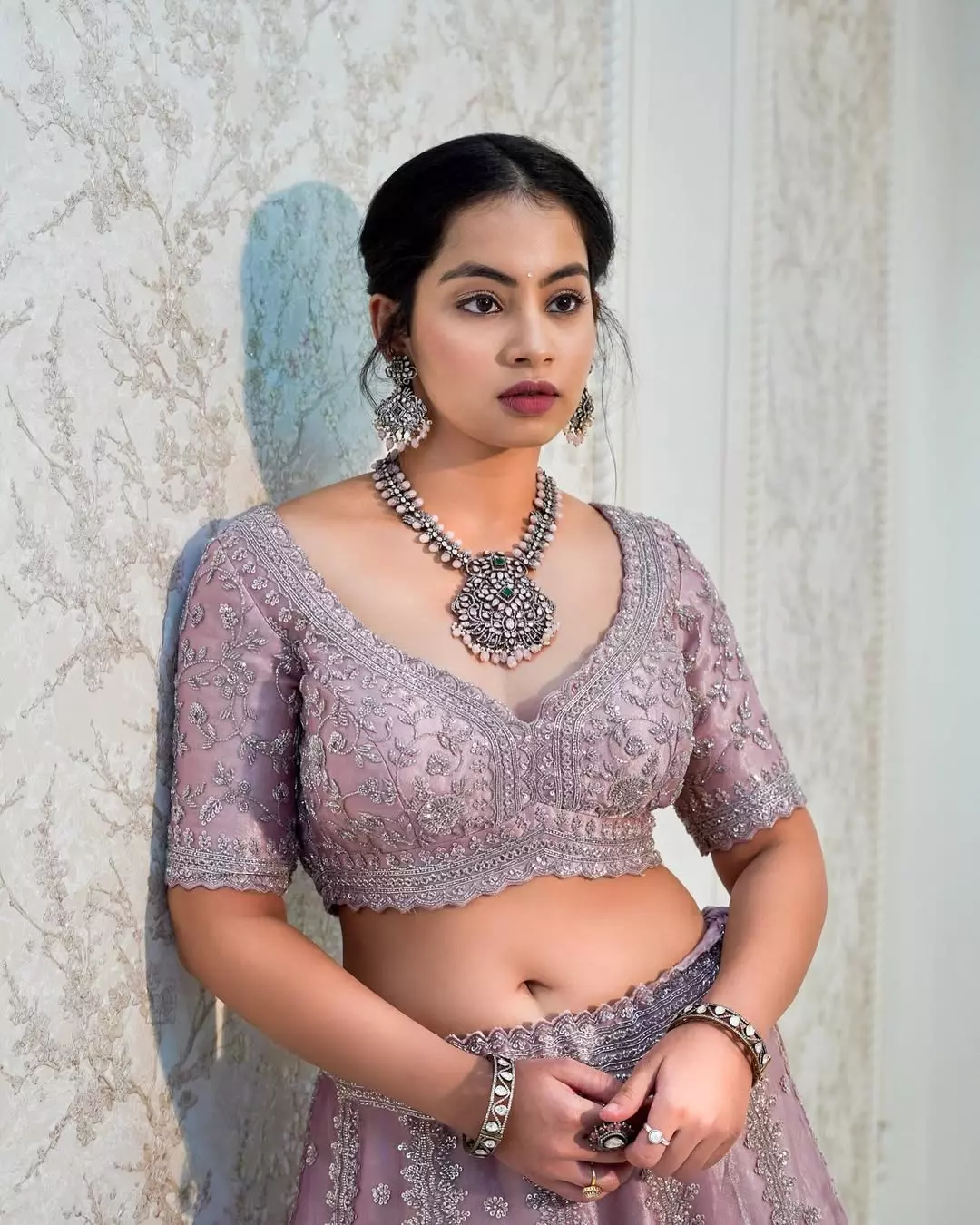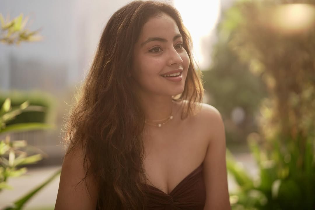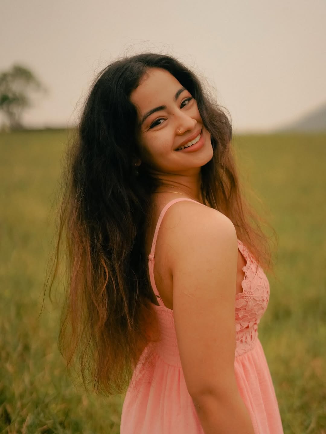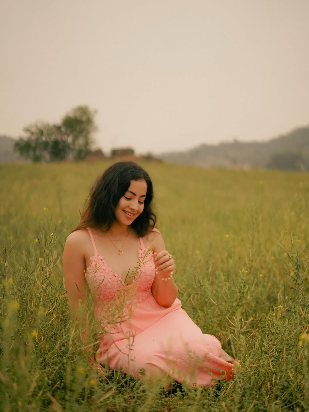 Dressed in a delicate blush pink dress adorned with floral lace, Shriya embodies calm and vulnerability against a serene outdoor backdrop.