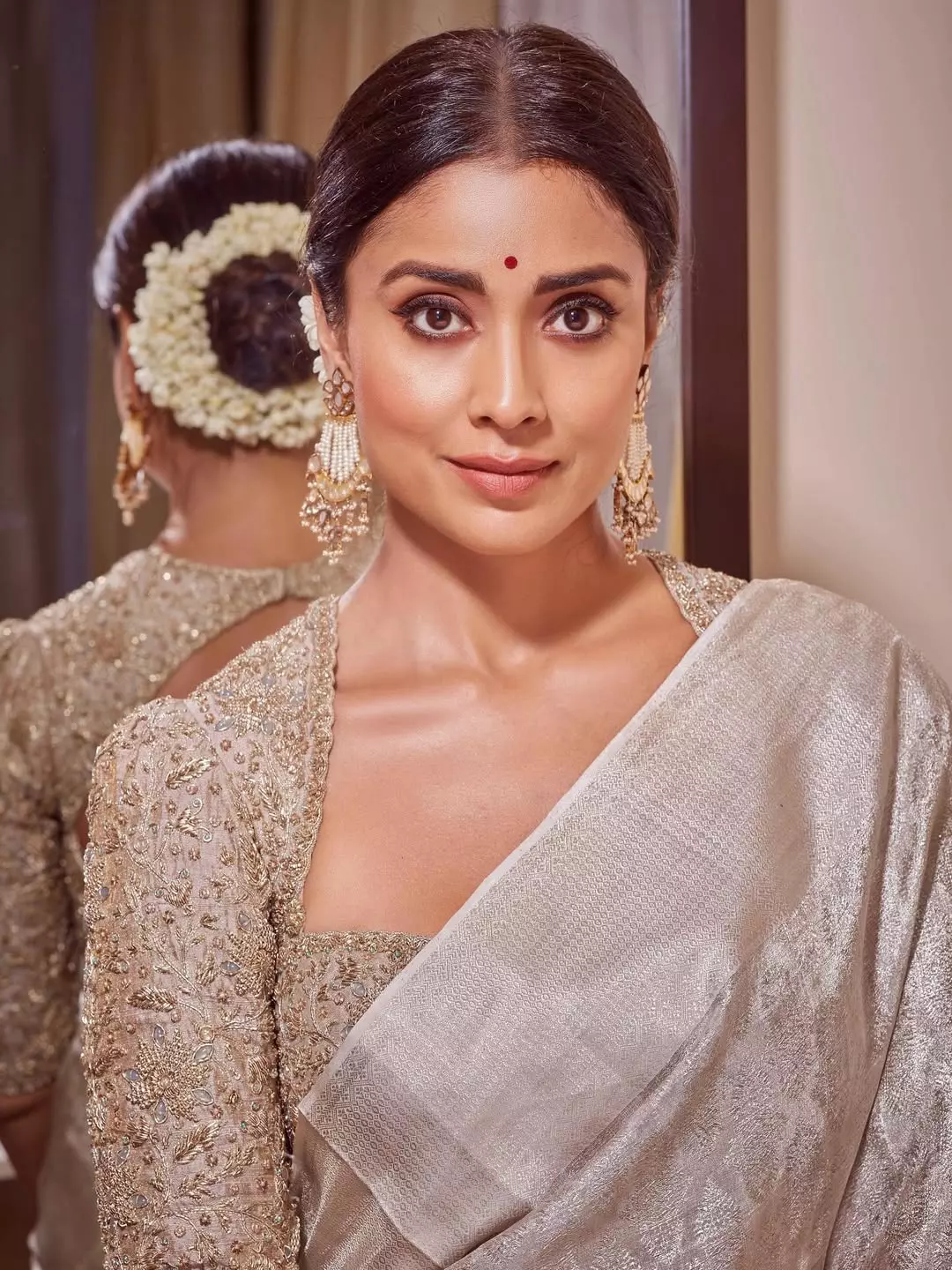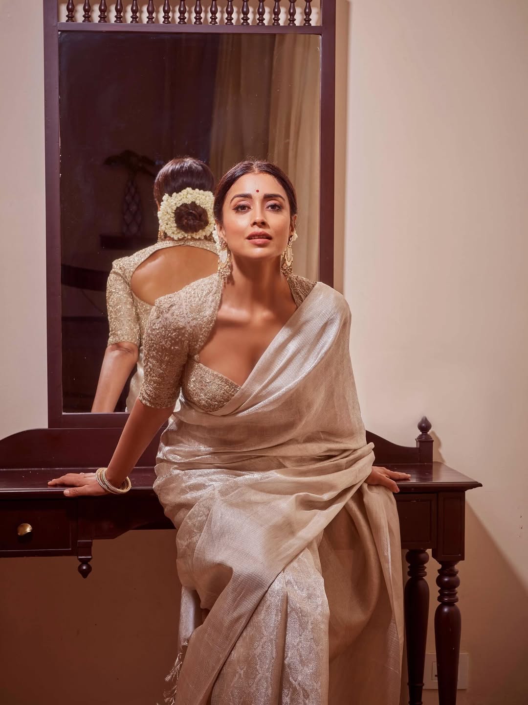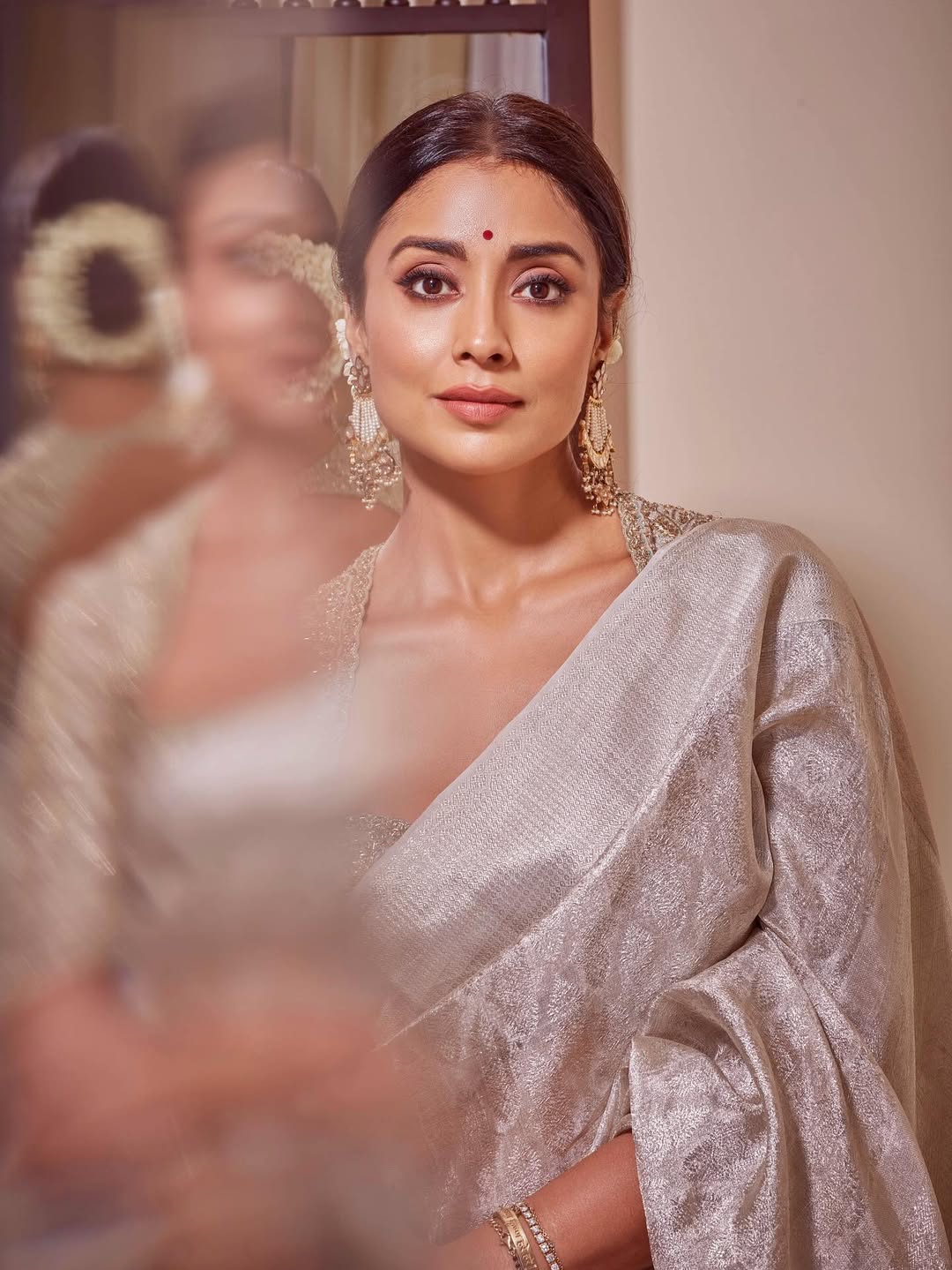 Captured by @arun_payyadimeethal, the shoot highlights Shriya’s effortless poise and glamour. Her hair, styled by @tinted_kisses_by_rajani, and flawless makeup by @makeupbymahendra7 perfectly complement the shimmering saree, while styling by @anjanababu812 ensures every detail is picture-perfect.