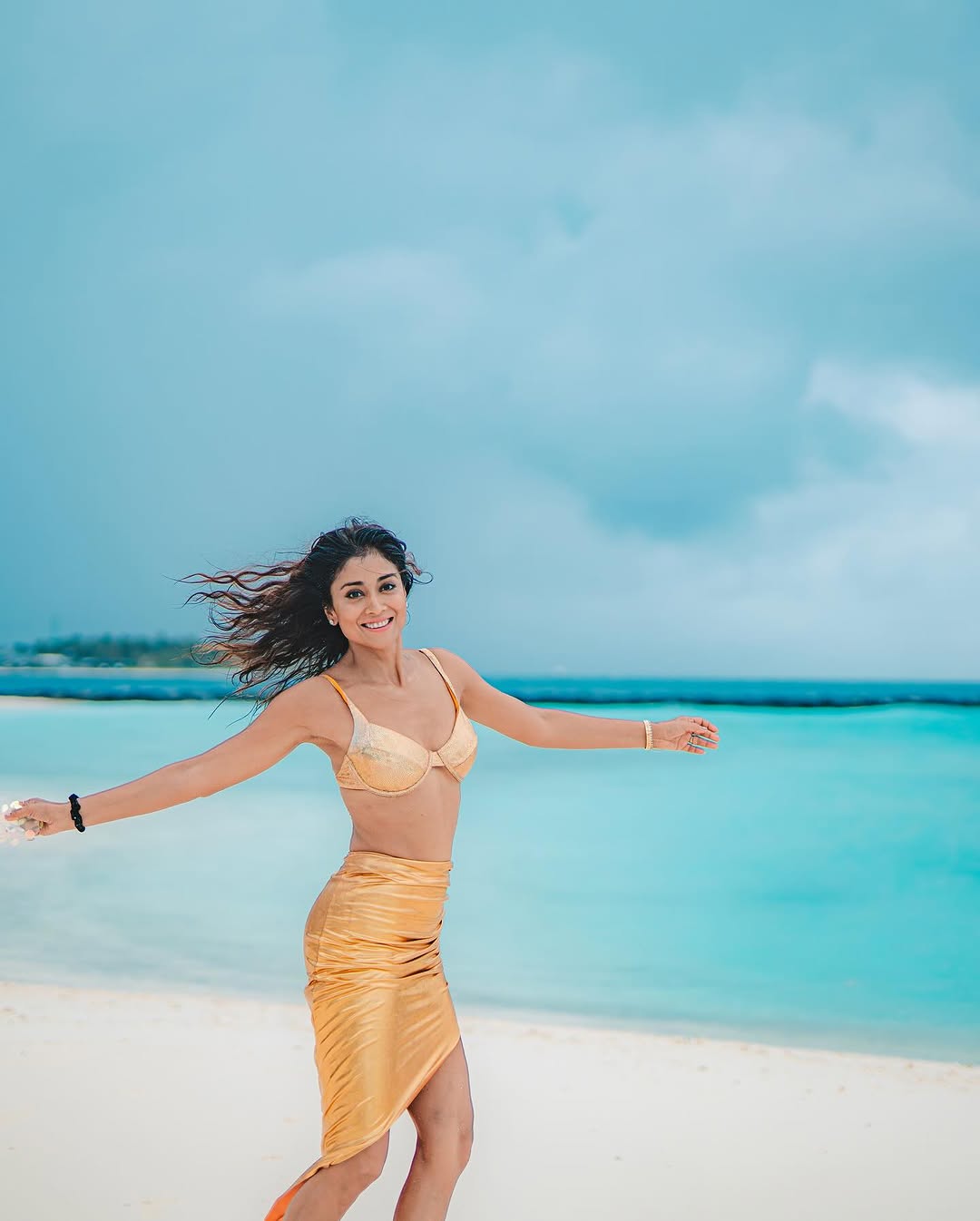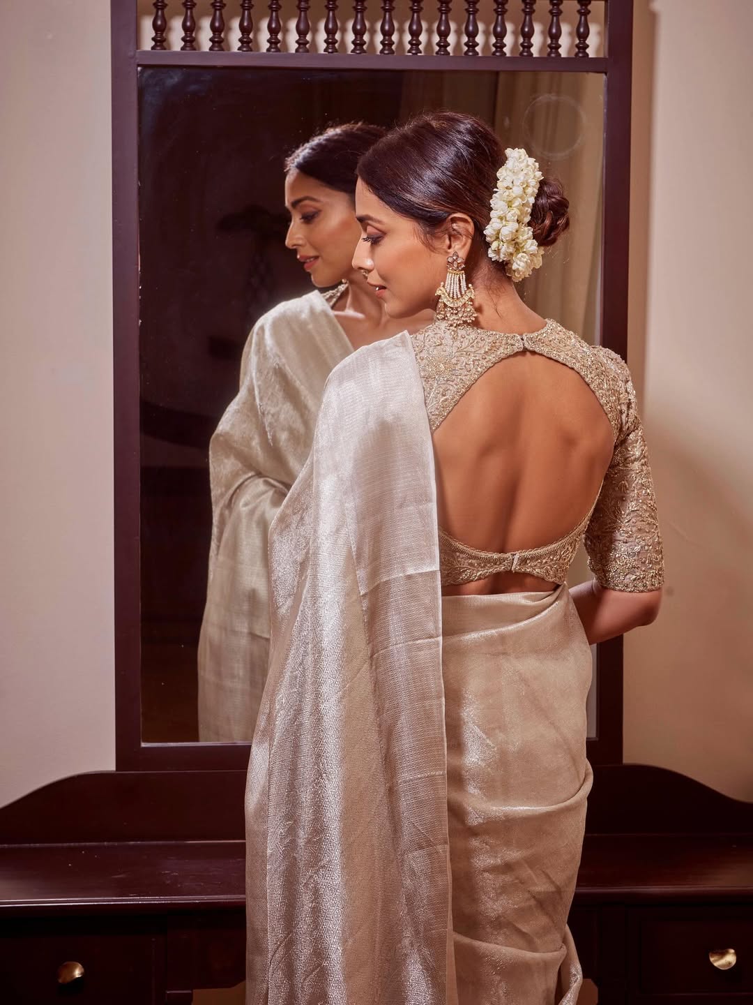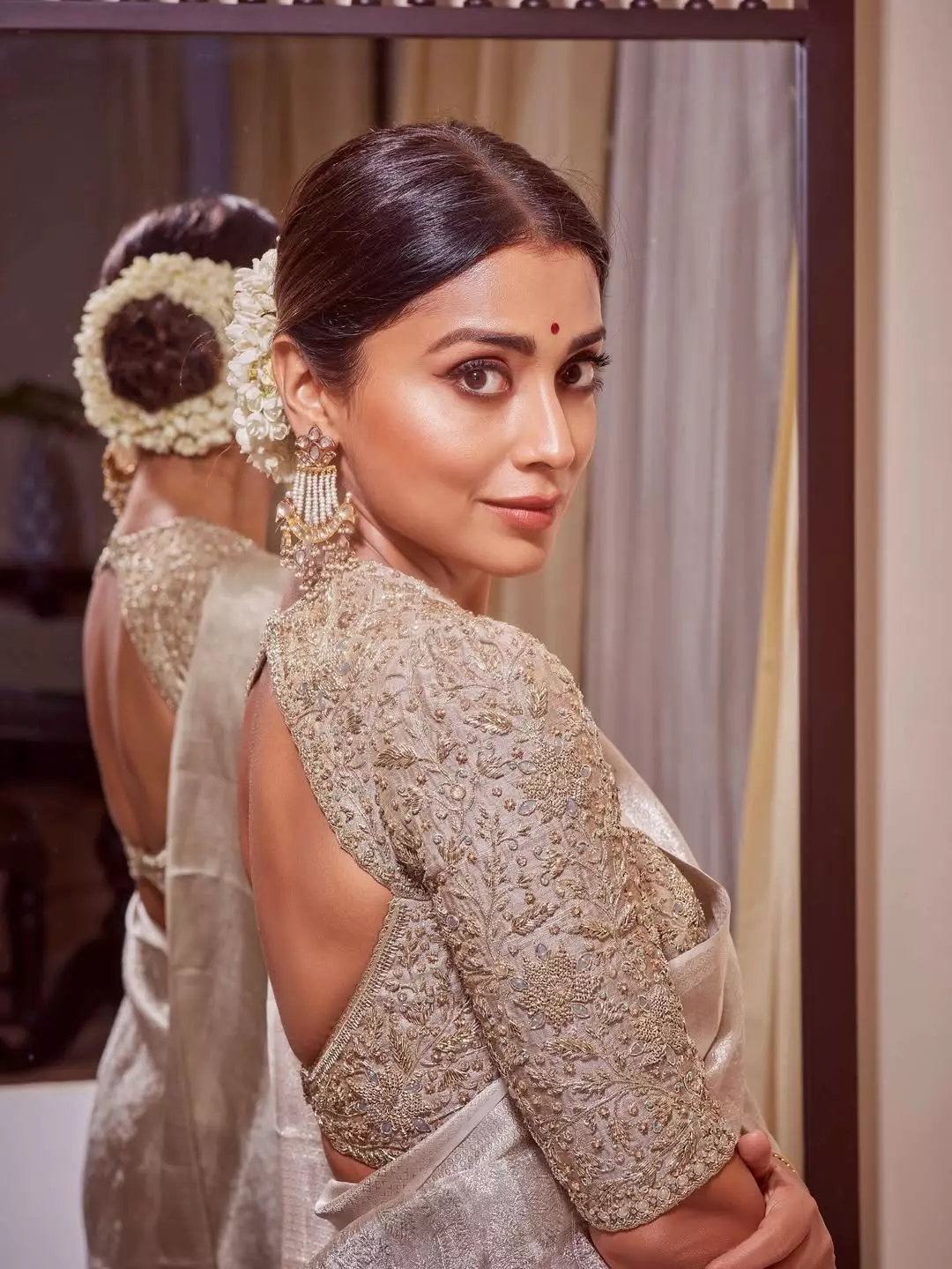 Captured by @arun_payyadimeethal, the shoot highlights Shriya’s effortless poise and glamour. Her hair, styled by @tinted_kisses_by_rajani, and flawless makeup by @makeupbymahendra7 perfectly complement the shimmering saree, while styling by @anjanababu812 ensures every detail is picture-perfect.