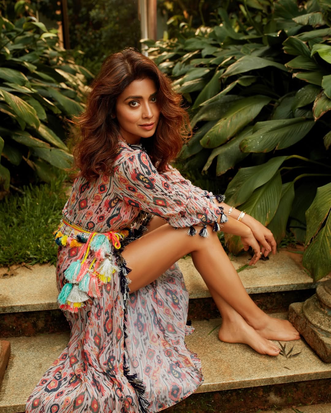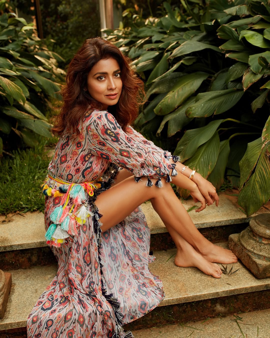 In the photo, Shriya looks adorable in a printed dress adorned with playful tassels that perfectly complement her graceful demeanor. Her glowing presence effortlessly draws attention, reminding fans of her timeless beauty. Shriya once a top star in Tollywood is widely recognized for her powerful performances in blockbuster hits like Sivaji and Chatrapathi. Although she took a step back from Telugu cinema for some time, her recent brief comeback stirred excitement among fans.