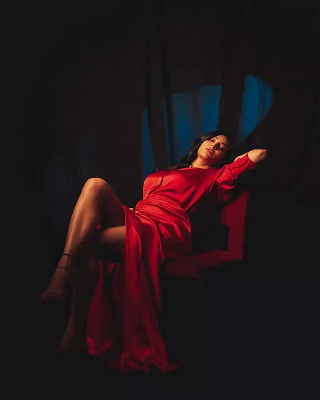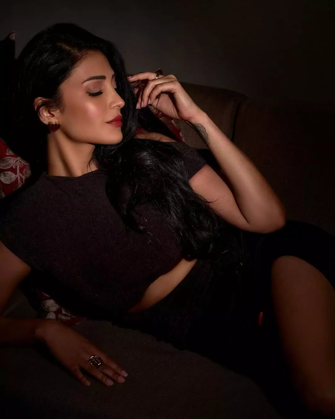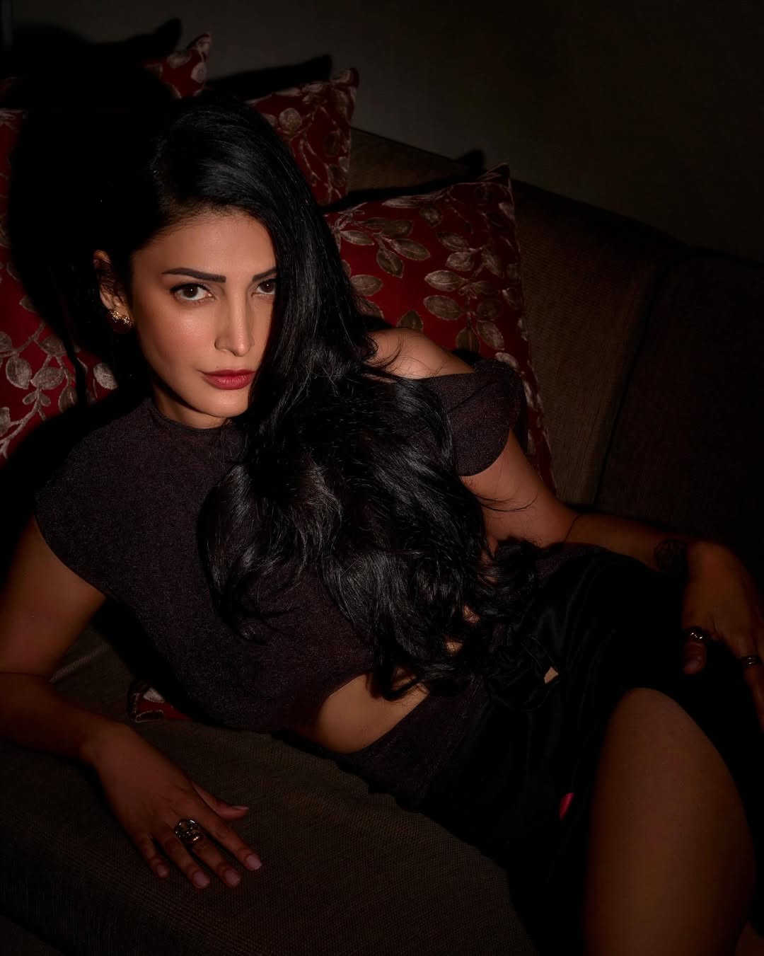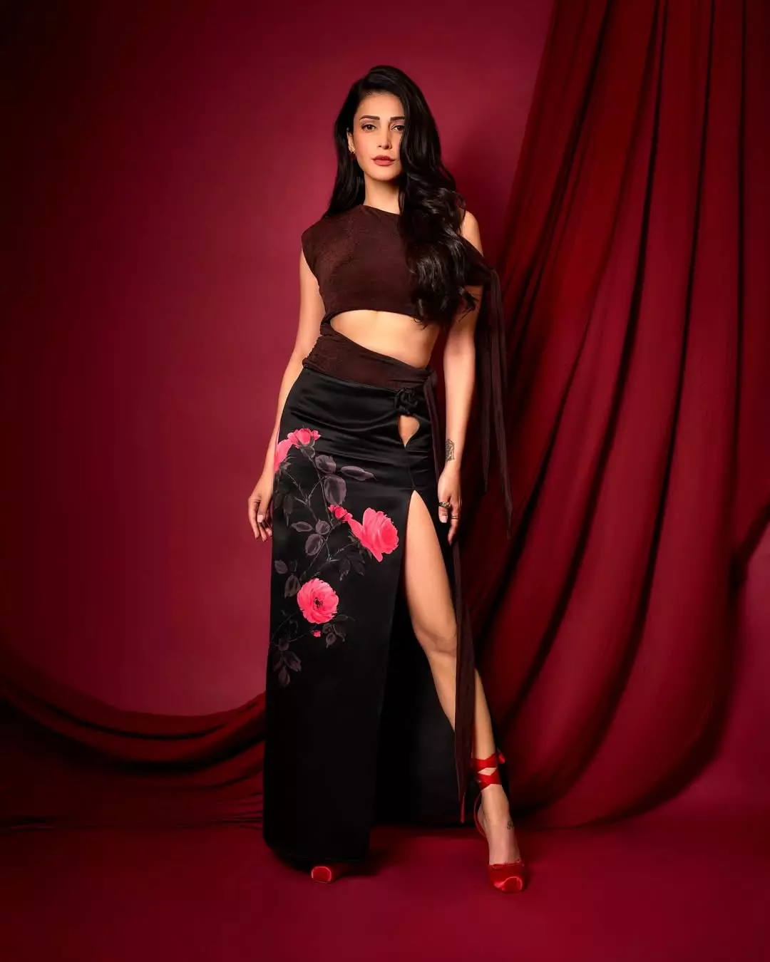Shruti Haasan continues to captivate fans with her timeless elegance, as seen in this stunning new photoshoot. Draped in a sheer brown crop top paired with a flowing black satin skirt featuring vibrant rose prints and a high slit, the actress exudes sophistication and allure. Her long, wavy hair cascades perfectly, complemented by bold makeup, statement jewels, and signature red heels.