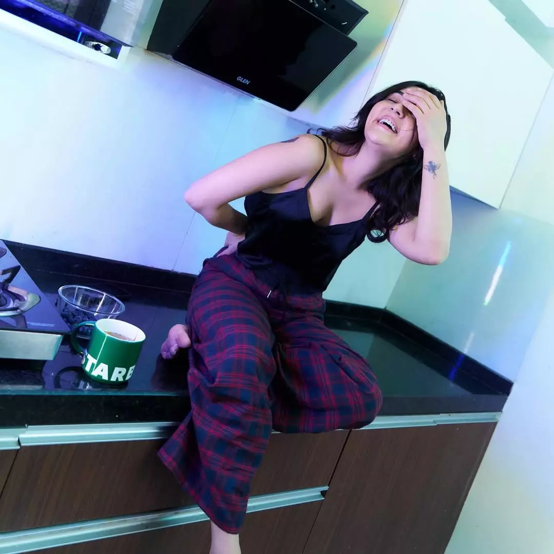 This captivating photo showcases Sidhika in a relaxed, intimate pose, wearing a deep blue cardigan over casual attire, with tousled hair and a playful expression. It perfectly embodies her #noedit philosophy: raw, confident, and effortlessly alluring against a simple backdrop.