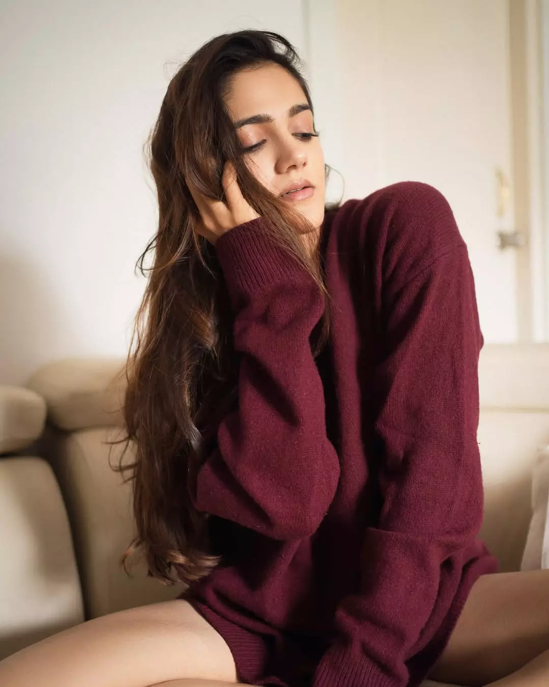 Simran Choudhary shared a new photo on Instagram. She sits on a cream-colored couch. She wears a maroon sweatshirt.