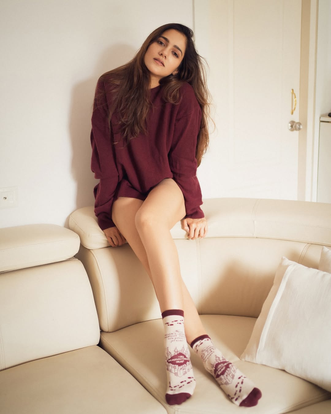 Simran Choudhary shared a new photo on Instagram. She sits on a cream-colored couch. She wears a maroon sweatshirt. Her hair is open and falls to one side. She adds a playful touch with socks that have a special print. The socks show the Marauder's Map from Harry Potter. Her caption reads, “Cartographer chic 🎶🧦✨.” She repeats the phrase in the text below the photo too. She also adds, “Simran choudhary Harry Potter marauders map portraits cartographer chic.”