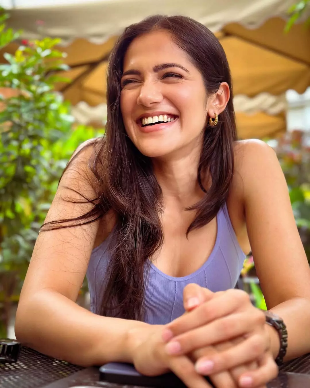 Simran’s contagious smile and the carefree vibe of this photo highlight her authenticity and effortless beauty. The greenery in the background adds to the relaxed, breezy mood, making this frame feel refreshingly real.