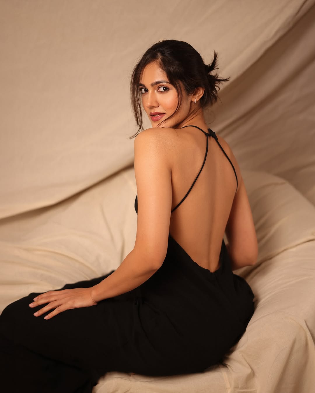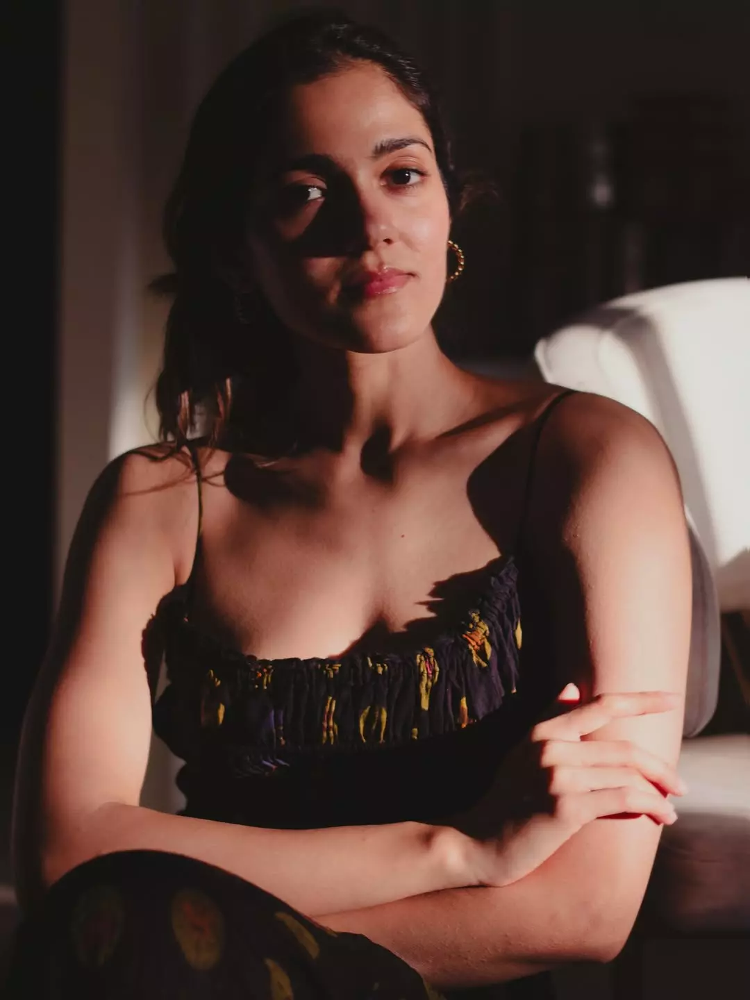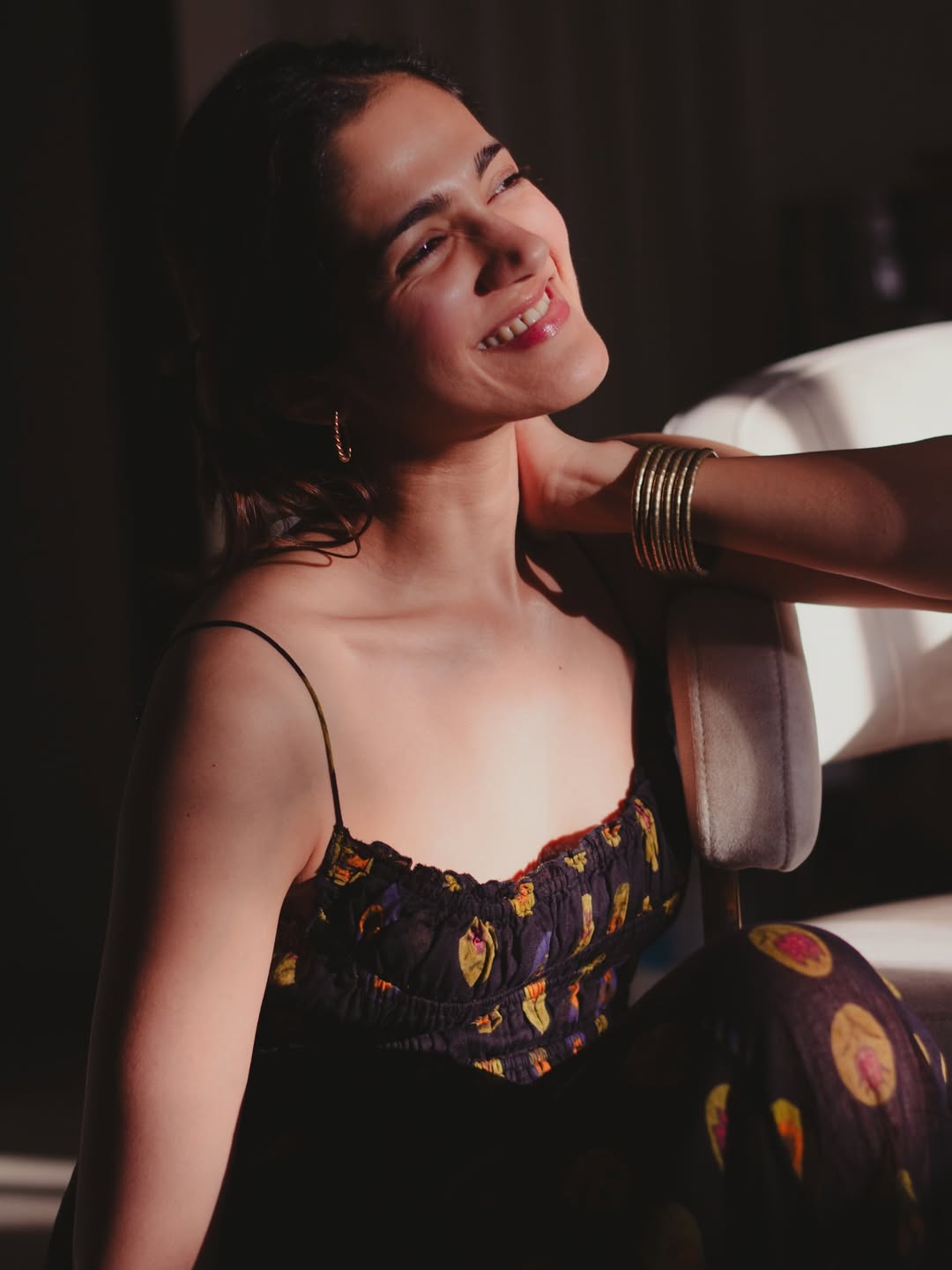 By: Tupaki Desk | 6 March 2026 4:31 PM ISTSimran Choudhary glows in the fading daylight in this mesmerizing photo, Capturing the last light . Bathed in warm, golden-hour hues, she sits poised on a cushioned chair in a dimly lit room, wearing a striking black spaghetti-strap top with a vibrant floral print in yellow and red accents. The ruched bodice hugs her figure elegantly, while her arms are crossed gracefully, highlighting her natural poise and subtle smile. Her long wavy hair frames her face, and gold hoop earrings catch the soft light, creating an intimate, dreamy atmosphere against the neutral backdrop—blending effortless beauty with quiet confidence.