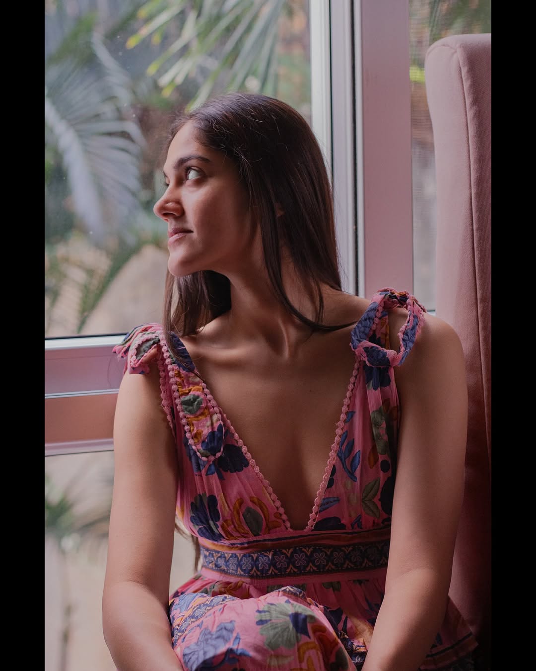 Simran Choudhary exudes effortless elegance in this stunning homegrown editorial photograph, where soft natural light and flowing curtains create a dreamy, intimate atmosphere. Dressed in a breezy pastel gown with delicate prints, she strikes a graceful pose that blends confidence with calm sophistication. The creative setup highlights a raw yet artistic vibe, perfectly captured in the note: Homegrown editorial: DIY edition @neharajuxo on styling + wind @sujana.zip on camera + curtains @poppyandtaco on hype + vibes. The minimalistic concept enhances Simran’s natural charm, making the frame visually captivating.
