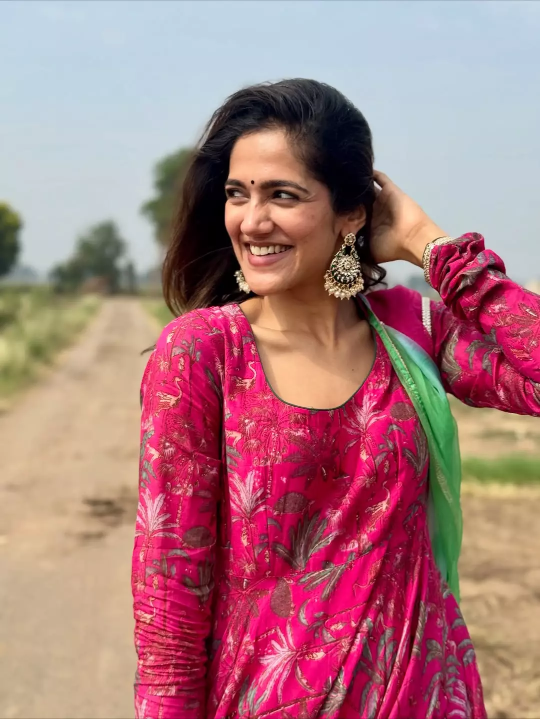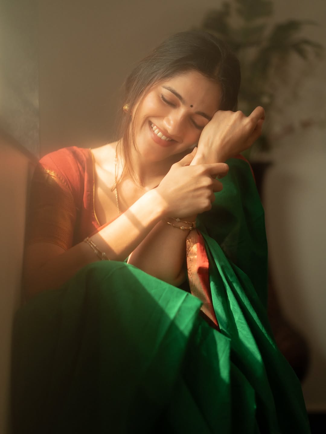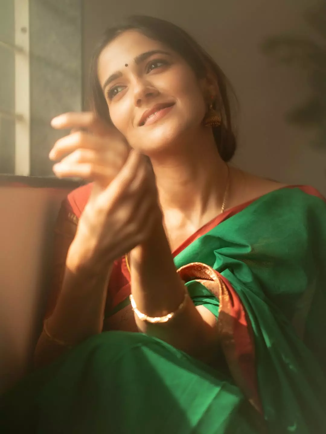 Actress Simran Choudhary exudes quiet elegance in this soulful gallery, capturing a moment that feels both intimate and timeless. Draped in a rich green saree with warm traditional accents, Simran’s look is rooted in classic Indian aesthetics while carrying a contemporary softness. The gentle play of natural light across her face enhances the mood, turning a simple pause into a poetic frame. As she sips from a brass tumbler by the window, the image beautifully reflects “The heart of waiting 🤍”—a feeling of calm anticipation, stillness, and introspection.
